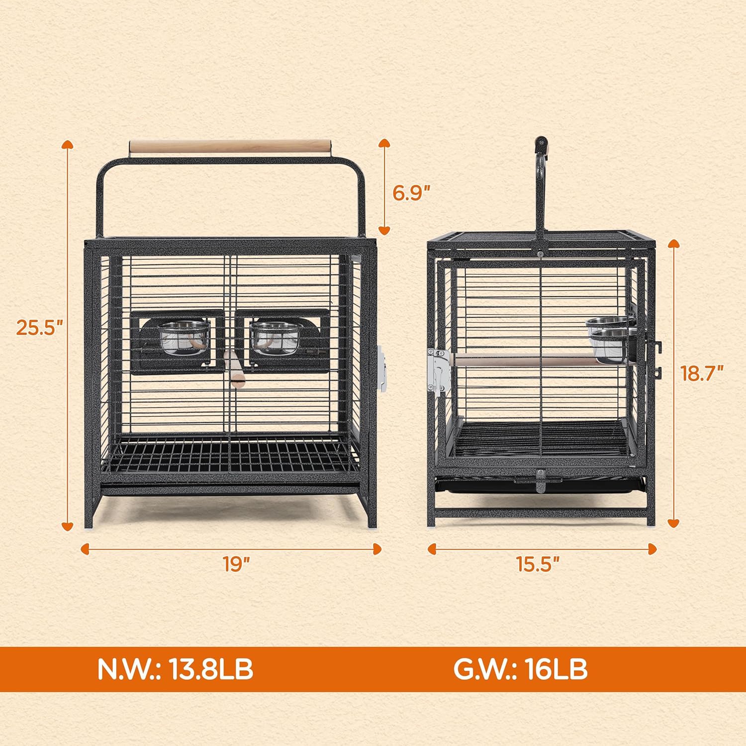 • Spacious Yet Portable: With dimensions of 19โ€ณL ร— 15.5โ€ณW ร— 18.7โ€ณH and a 0.6โ€ณ bar spacing, this bird carrier cage offers ample space for small to medium birds like canaries, budgies, lovebirds, conures, and cockatiels while remaining easy to transport