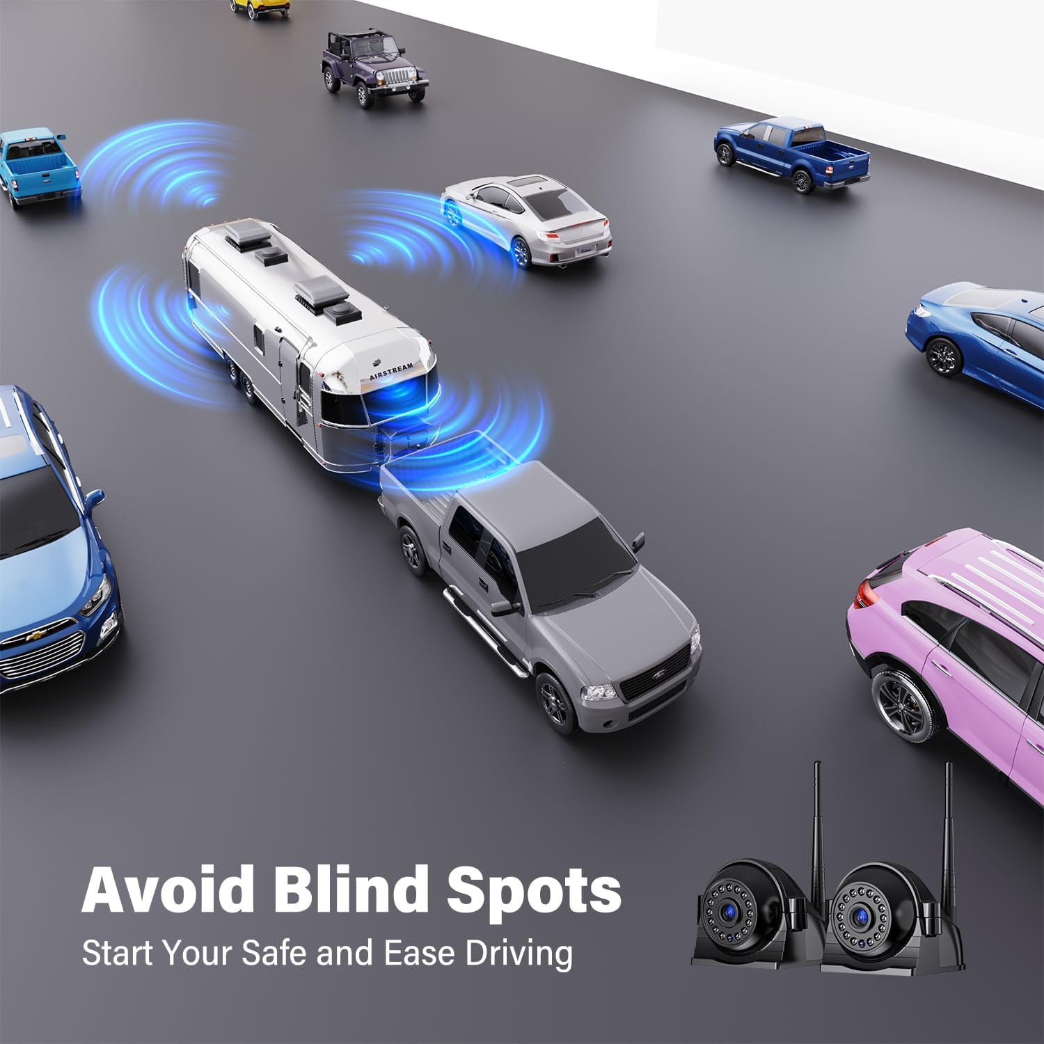 - ๐๐ Long Signal Transmission Distance - This trailer backup camera wireless with monitor is suitable for Cars, RV, Truck, Semi-Trailer, Pickups, Camper, Van, 5th wheel, Motorhome. The signal can reach over 300ft in open area, and 50ft on vehicle for reversing or 36ft on vehicle for continuously use. With IP69K waterproof standard, the wireless backup camera rv can work in extreme weather from -4โ~176โ. No lens water or fog issues.