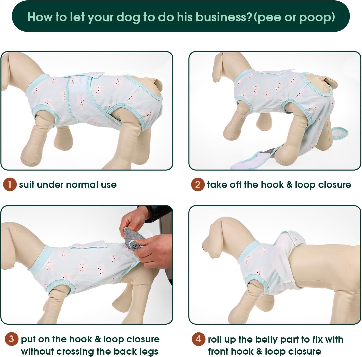 • Easy to Wear: When your dog needs a bathroom break, remove and secure the tapes with provided instructions, aiding wound recovery. Made from machine-washable materials, it's completely safe for your pet