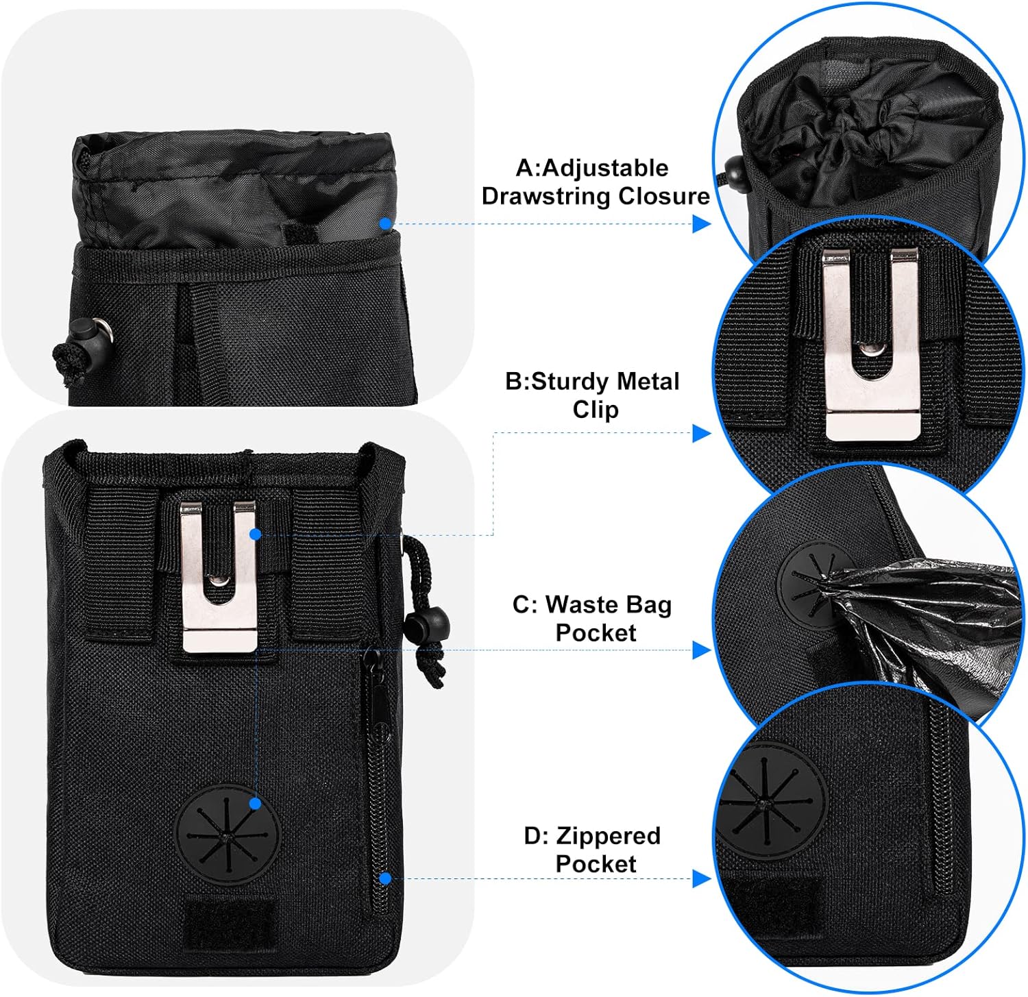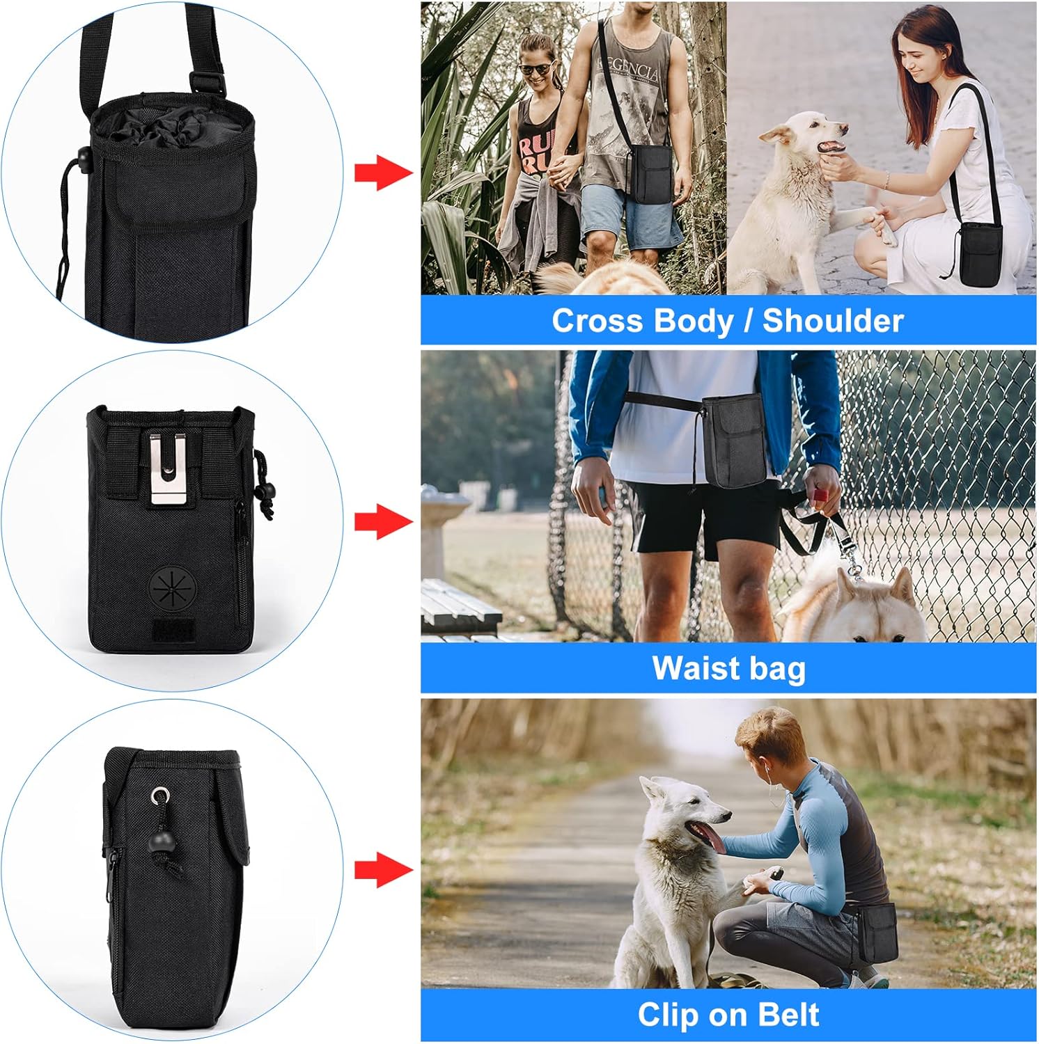 • Dog Travel Accessories: two detachable pet training bags make the pet organizer more functional.The on-the-go dog treat pouch can carry your dog's favorite treat and toys.With big opening and drawstring closure allows quick access to pouch with one hand.You can also securely store your personal belongings, such as phone, keys, or wallet in the pouch.Perfect choice for dog training at the park.