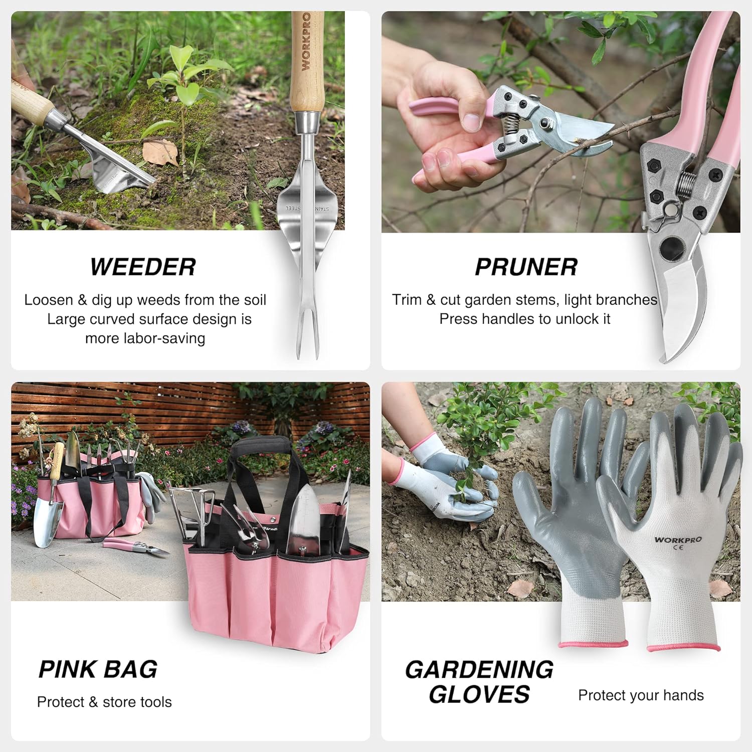 WORKPRO 8-Piece Pink Garden Tool Set, Stainless Steel Gardening Tools with Wood Handle, Including Garden Tote, Gloves, Trowel, Hand Weeder, Cultivator and More, Gardening Gifts For Women - Pink Ribbon