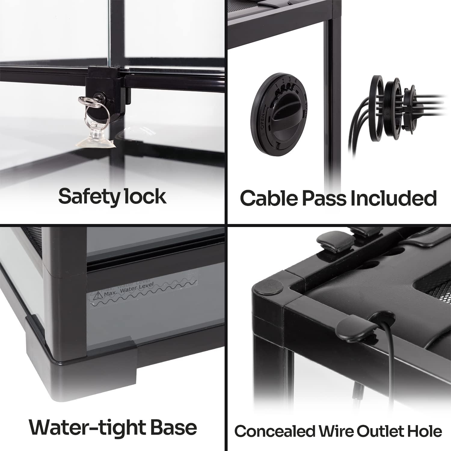 • ใ€Raised Bottom Frameใ€‘: This reptile tank has 8 inch deep base, waterproof bottom makes this tank can be used as rainforest tank. Raised bottom frame in order to fit a substrate heater.