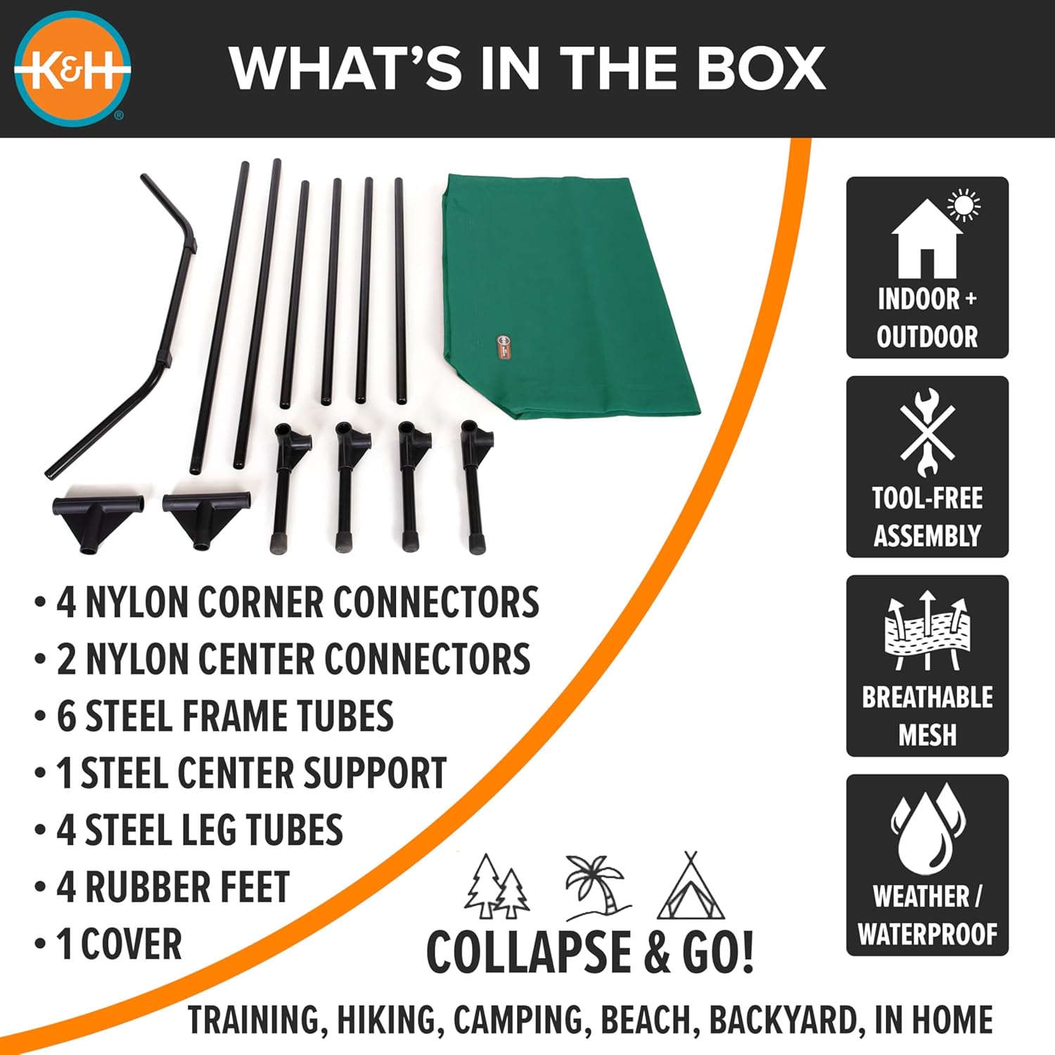 • EASY TOOL-FREE ASSEMBLY: Collapsible outdoor dog cot is easy to assemble and disassemble, no tools necessary making this portable bed great for use at home or during travel, camping, picnicking, place cot for dog training and more