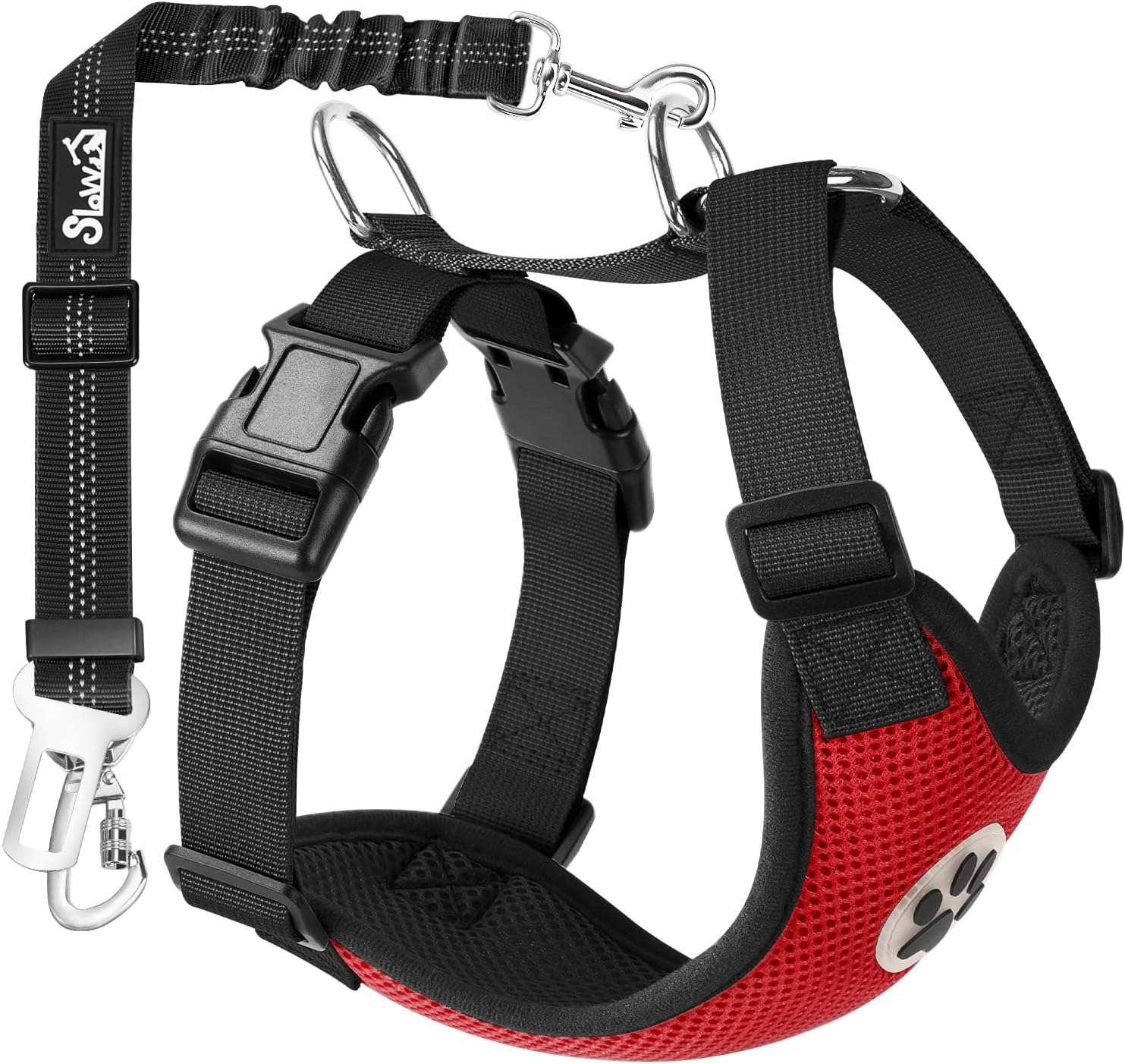 SlowTon Dog Seat Belt Harness for Car, Dog Car Harness Adjustable Mesh Breathable & Dog Seatbelt Safety Tether with Elastic Bungee for Small Medium Large Pets(Red, Double Clip, XXXS)