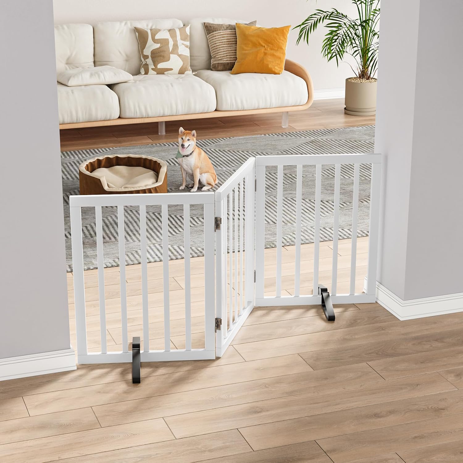 • FOLDING AND EXPANDING DESIGN: This pet gate is stand alone, no-drill, and features a 360-degree hinge design that allows you to fold it into a wide z shape or temporarily enclose it into a square fence. The wide slats of doggie gate for indoors provide a secure barrier without making your pet feel like they are completely isolated from your home