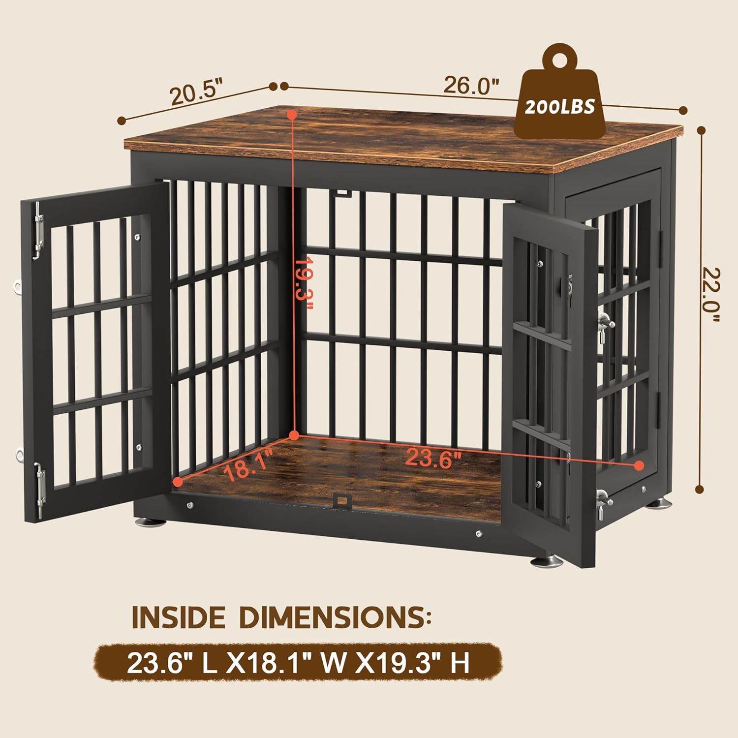 • 【Assemble with Ease】 Inside Dimensions: 23.6"L x 18.1"W x 19.3"H, Overall Dimensions: 26.0"L x 20.5"W x 22.0"H. Choosing the right crate size is vital to ensure your dog’s safety and comfort.