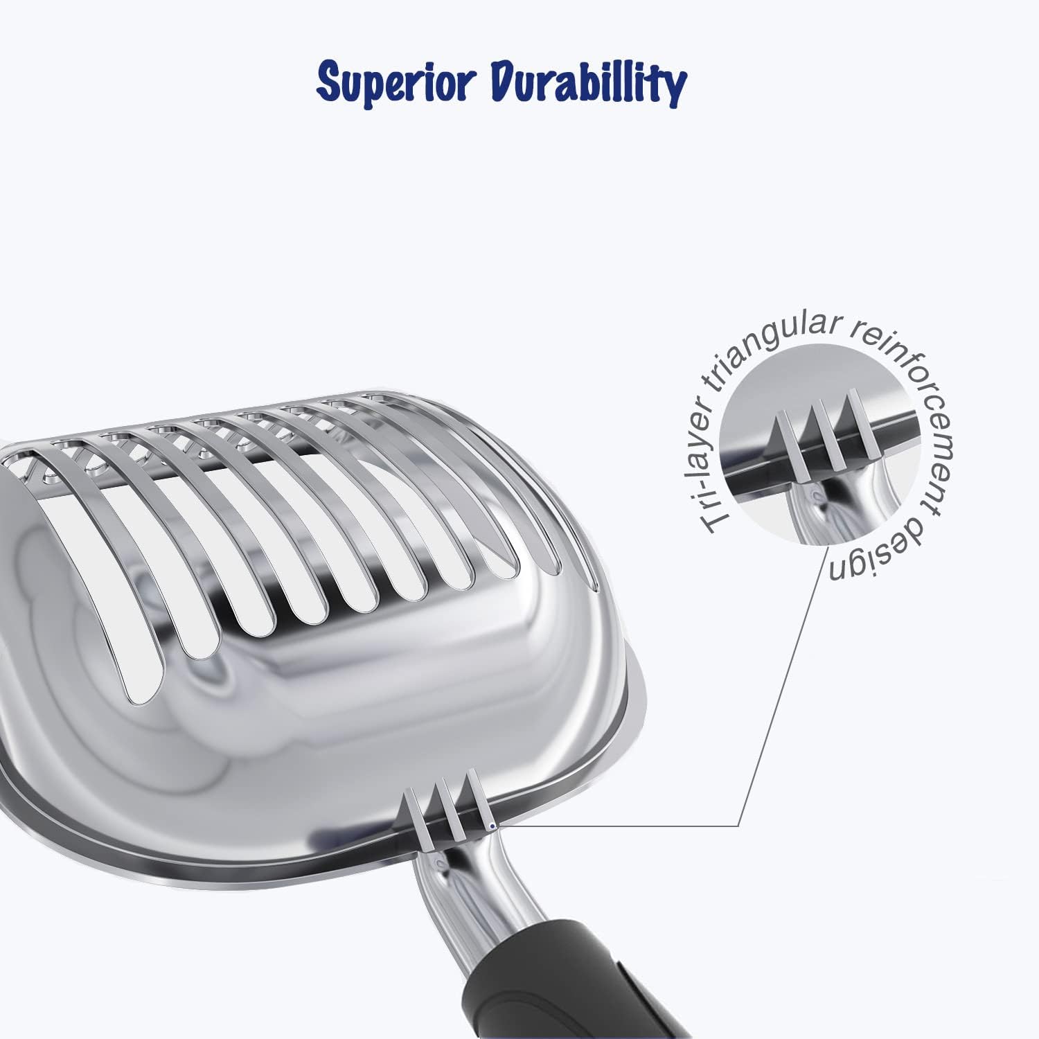 • [Features]: WePet made this scooper durable with heavy duty quality. After investigation with thousands thoughtful users, we finally make an improvement of removing the serrated edge as mentioned on reviews. The body is waterproof and very easy to clean, rust-resistant and corrosion resistant. It’s highly recommended by cat lovers for everyday use.