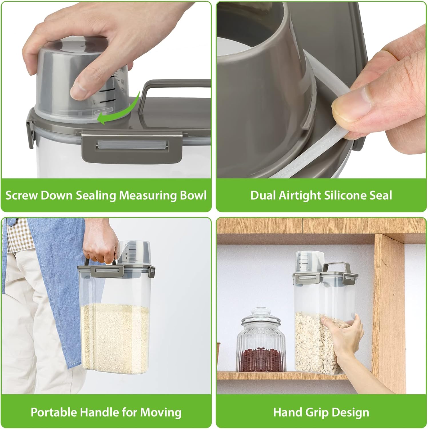 • RICE DISPENSER with POURING SPOUT: it adopts an ergonomic handle, comes with a measuring cup. The barrel body has a standard scale so you can pour things quickly and accurately every time. Slim and compact and space-saving