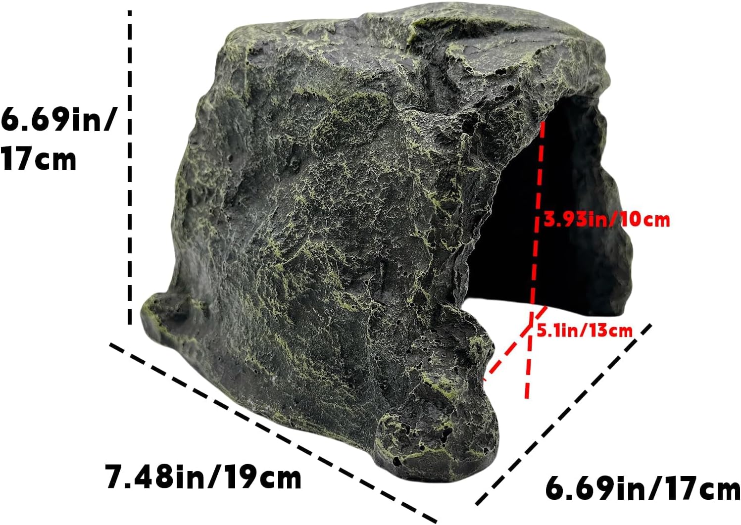 • 【Large Hideout】With only one entrance, the reptile hideout allows reptiles to better conceal themselves, satisfying their natural hiding instincts and making them feel safe and relaxed. The dimensions of the rock hideout are 7.4"x6.6"x4.7" inches, with the internal cave measuring 5.1"x5.9"x3.9" inches,not suitable for large turtles, providing a spacious and secure area for reptiles to sleep, rest, play, or breed.
