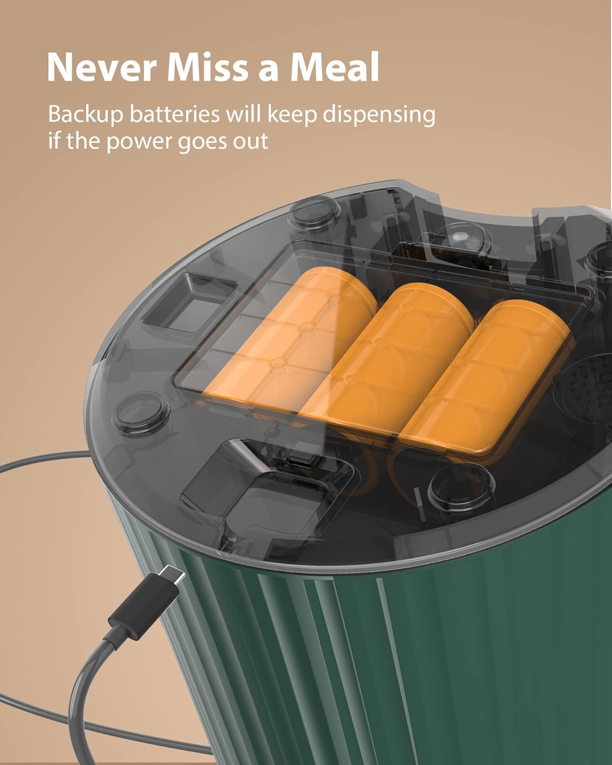 • Dual Power Supply: When you plan to leave your cat for several days, an automatic feeder with battery backup will keep dispensing even if the power goes out and your cat won't starve. If power goes out without batteries inside, the meal settings are memoried when power comes back on.