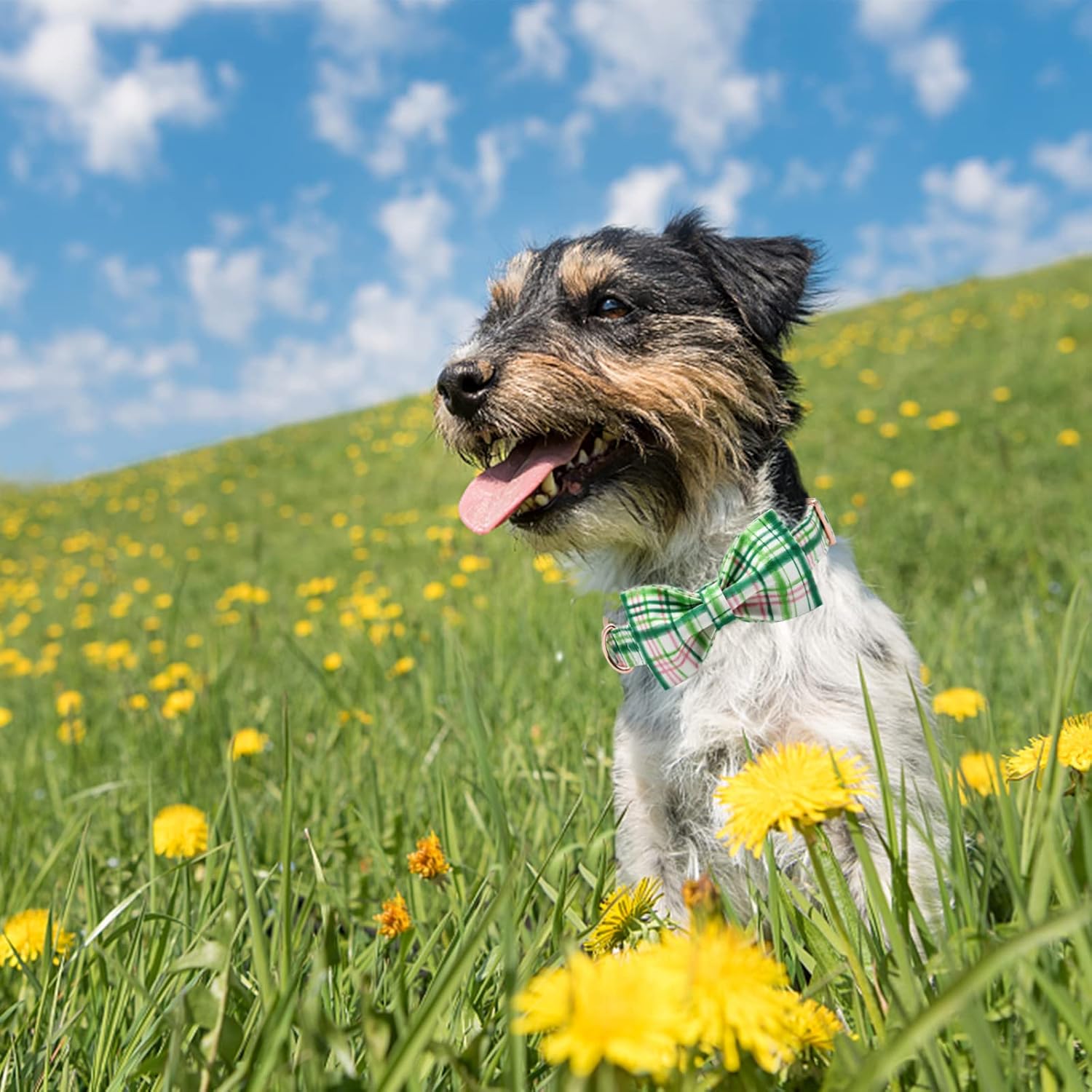 Elegant little tail Dog Collar with Bow - Pink with Green Plaid Boy or Girl Dog Collar Cute Bowtie Pet Collar Adjustable Dog Collar for Small Puppy