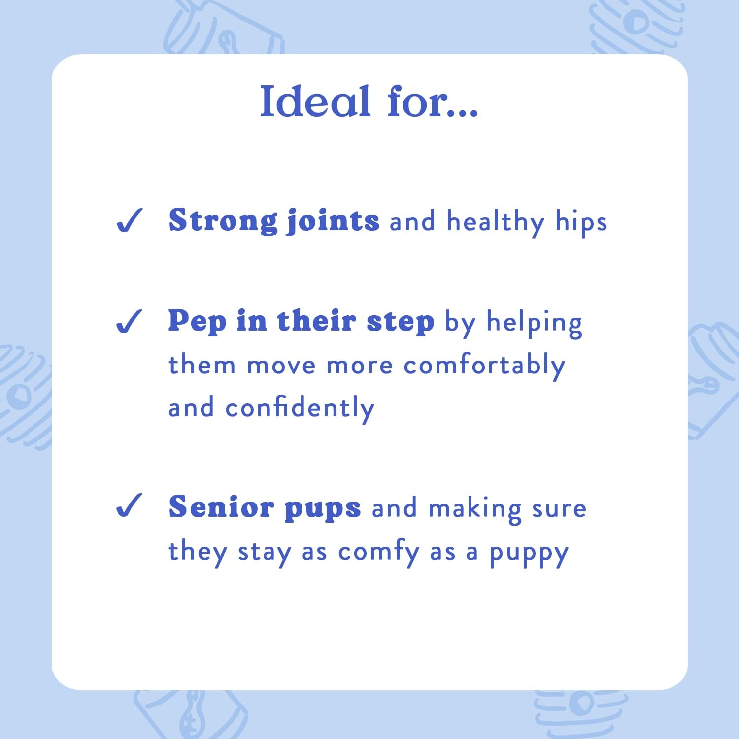 • Let’s keep the pep in your pup’s step! An advanced (... and extra tasty!) formula to help your dog move more comfortably and confidently – without the artificial flavors.