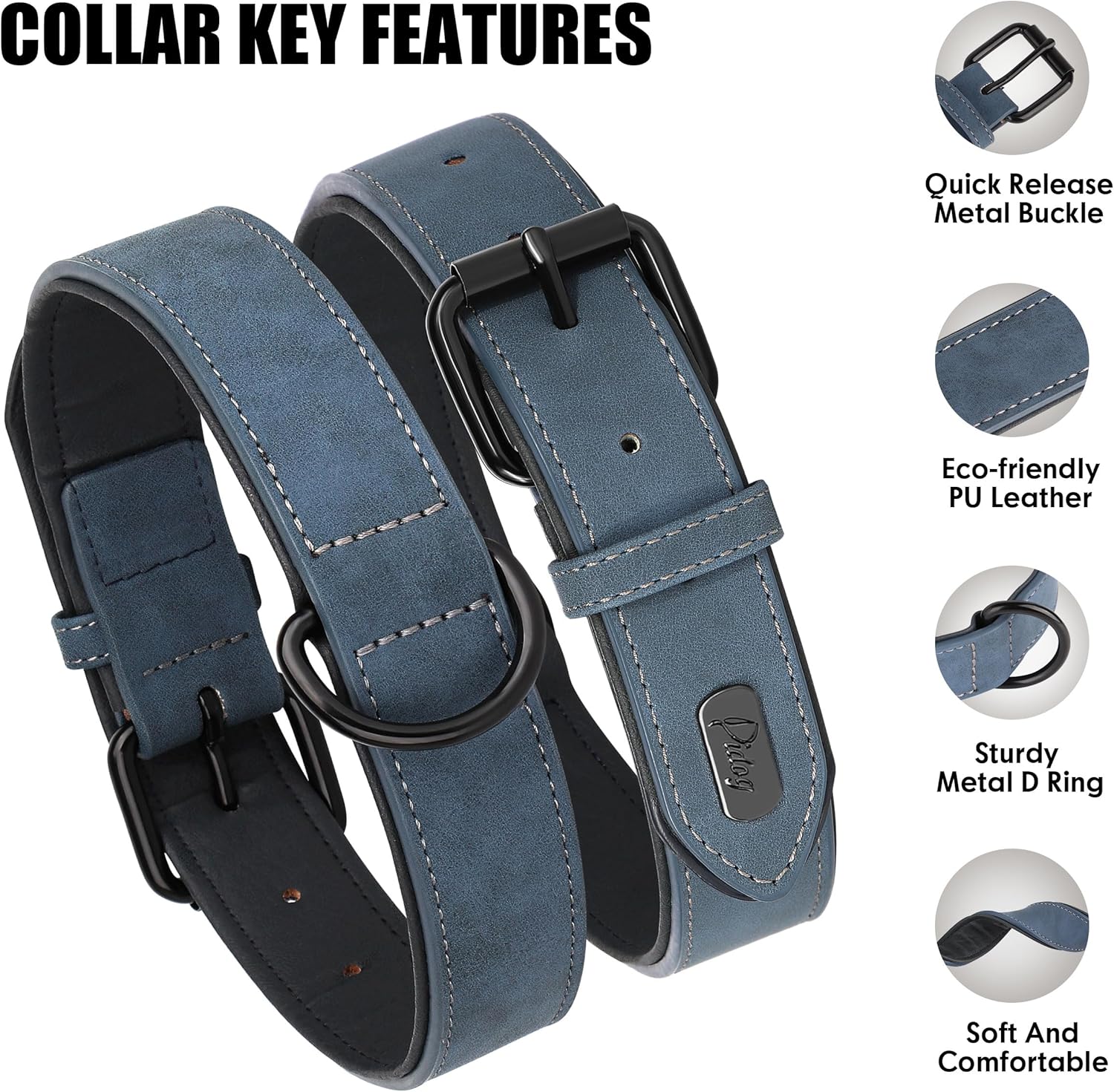 Didog Soft Padded PU Leather Dog Collar, Breathable and Adjustable Dog Collars for Medium Dogs, Comfortable for Daily Walk, Blue, L Fit Neck 13-17"(22-44 lbs)