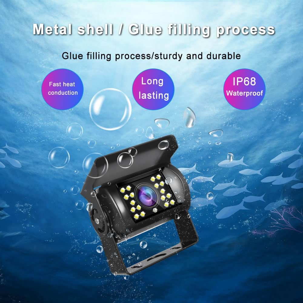• ใ€IP68 Waterproof Reverse Camera (No Guide Lines)ใ€‘Hard Metal Cased Camera, waterproof and Mud proof. 18 IR LEDs for Night Vision + 120ยฐ horizontal wide view angle + 180ยฐvertical adjustable angle to view the blind spots. You can get it work Full Time when connect to constant power source