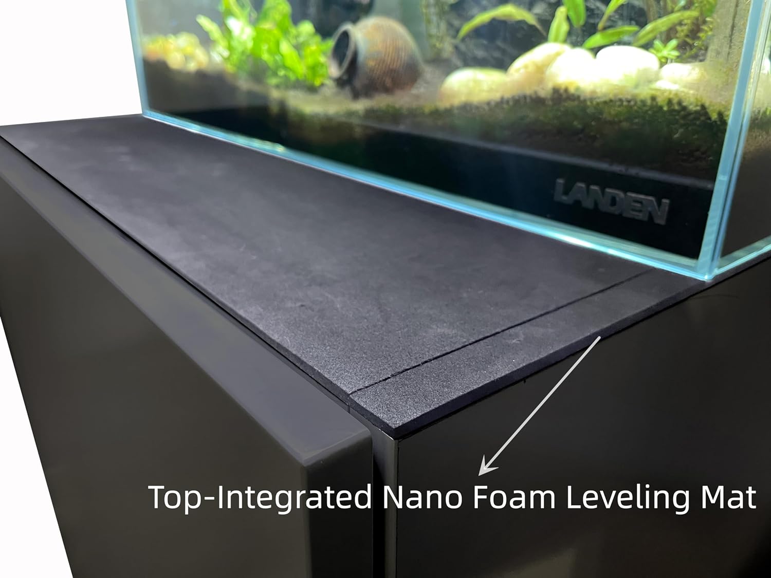 - γStable and Modern Designγ Features a contemporary minimalist style suitable for rimless aquariums, seamlessly matching any home decor with its simple black and white theme. The cabinet edges are treated with German sealing edge technology for a perfect seamless appearance, accompanied by spacious storage for large aquarium equipment.