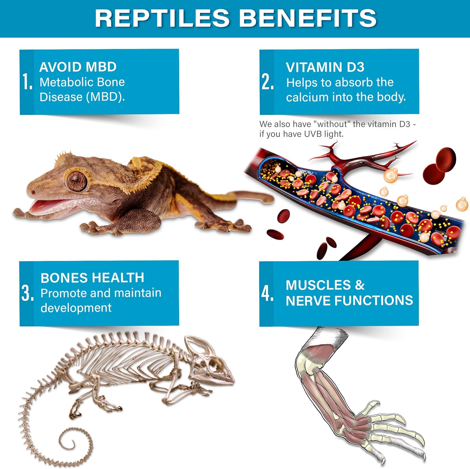 • ESSENTIAL. Let’s help your reptiles and amphibians to stay healthy and prosper! Calcium deficiency in reptiles is a major contributing factor in Metabolic Bone Disease (MBD). Gargeer’s All Reptile Calcium Powder serves as a perfect supplement for all reptiles & amphibians in captivity, aimed to promote and maintain bones, muscles, and nerve functions.