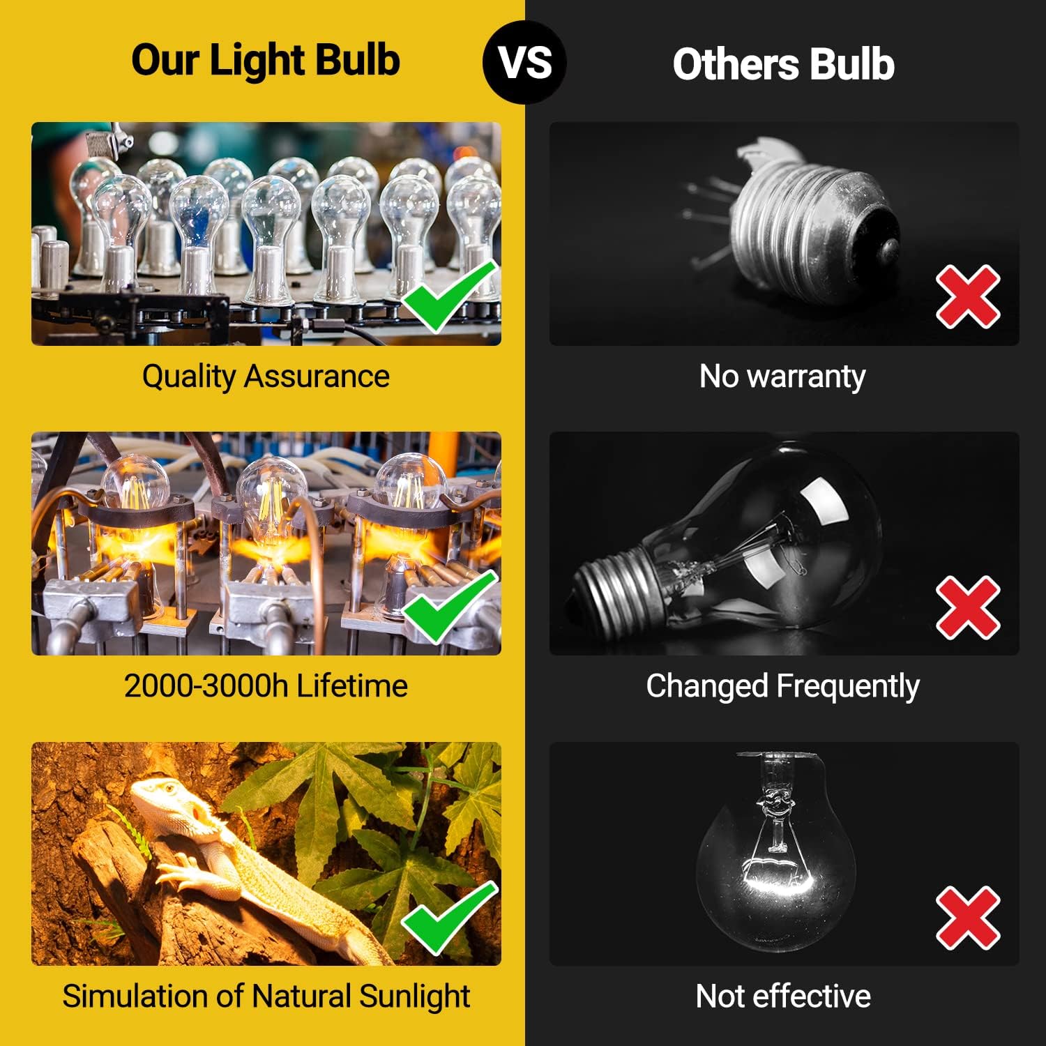 - ใStrict Quality InspectionใEach REPTI ZOO light bulb is strictly tested as 4-stage inspection, appearance inspection, 20 sec lighting test, 30 min aging test and 2 times pulse voltage. We have passed the safety certification to ensure the service life and stability of lamps.
