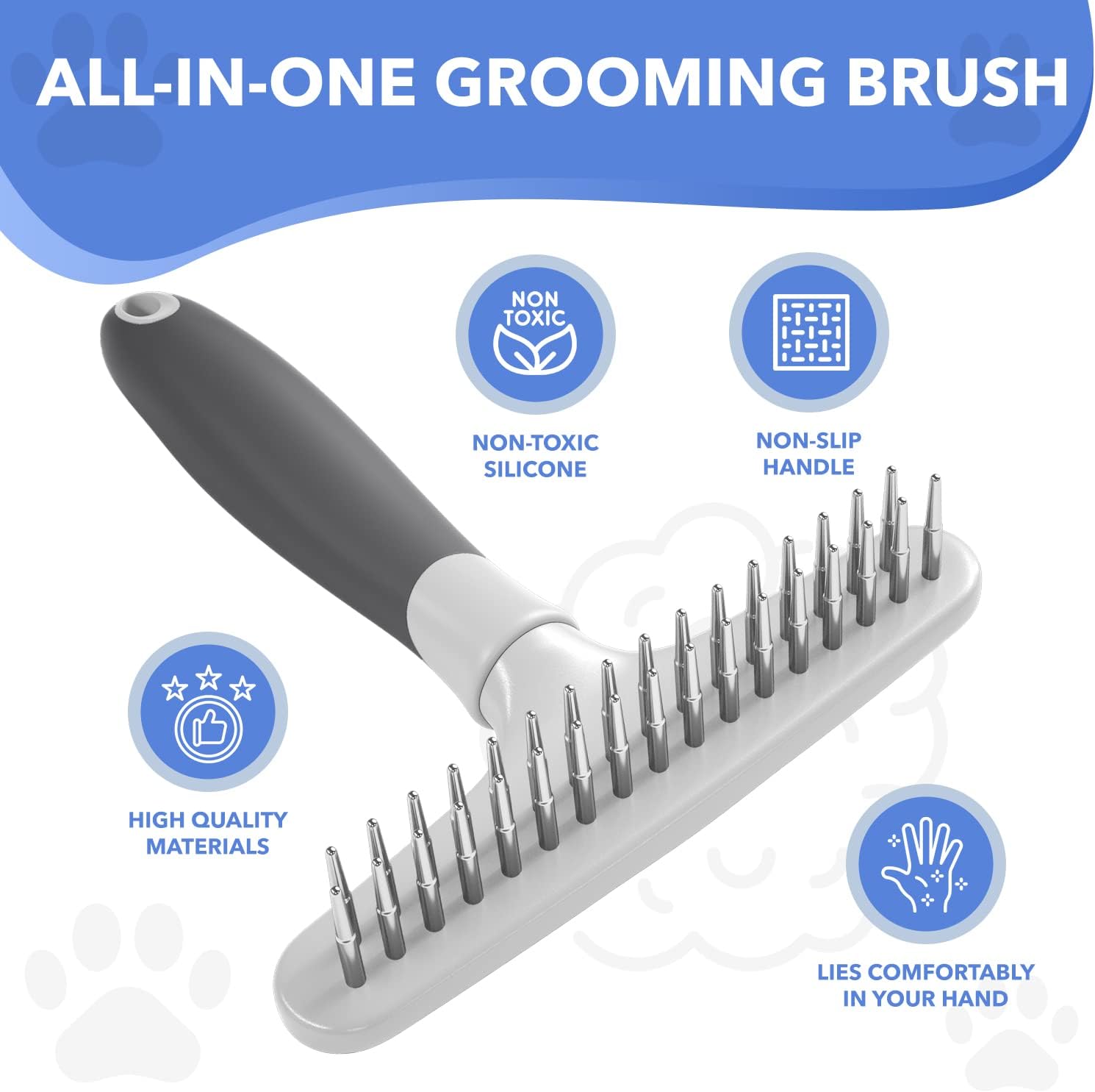 • One of the best dog brushes on the market, It has a double row of stainless steel pins/teeth to reduce pulling the coat without damaging it or hurting your pet. It is a very gentle experience for your dog, cat, rabbit, or any other furry friend that needs brushing.