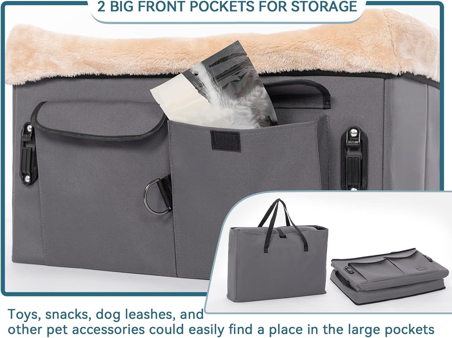 • [Easy to use] Easy to store when not in use thanks to the collapsible design, sturdy construction, and quick installation and removal in the backseat of a car. There are 2 storage pockets that can transport the daily needs of a pet. Additionally, the dog car seat has an adjustable buckle design which is suitable for a variety of car types and can be quickly installed on most standard car seats.