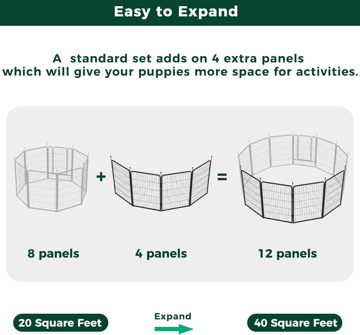 • Supper easy to assemble: It won’t take you more than 5 minutes to assemble these portable dog fences as well as pack them away due to the rod-connected design. Meanwhile, panels can be added or removed freely to give you a fully flexible area and arrange the dog pen in any shape you need.
