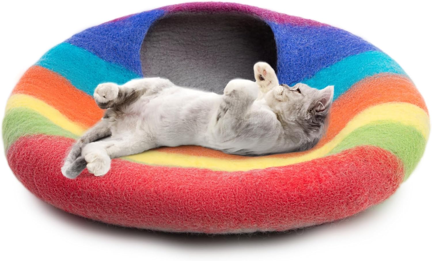 Woolygon Premium Felt Cat Cave Bed โ€“ Wool Kitty Beds Handcrafted Kitten Caves Bed for Indoor Cats - Made from 100% Eco-Friendly Merino Wool, Foldable Cat Hidewawy Covered Cat House Pod (Rainbow Twist)