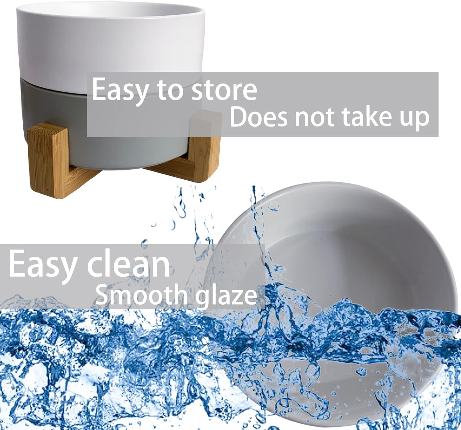Ceramic Dog Cat Bowl with Wood Stand,Cat Food & Water Bowls Elevated Non-Spill Modern Cute Kitty Dishes Heavy Weighted Round Pet Dishes Set for Small Kitten Grown Cat(Grey)