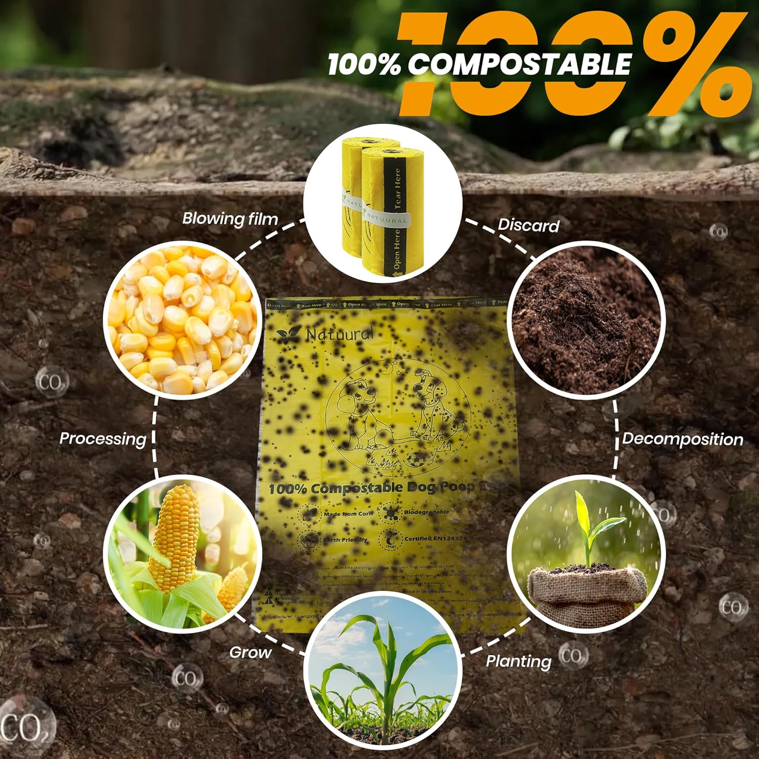 • [Certified Compostable] These compostable dog poop bags are designed from plant-based materials. We only use corn starch, PBAT (fully compostable polymers) of our doggie poop bags. they are complying with the highest standards of US ASTM D6400, NF T51-800:2015 and EU EN13432, they are easy to open and durable!