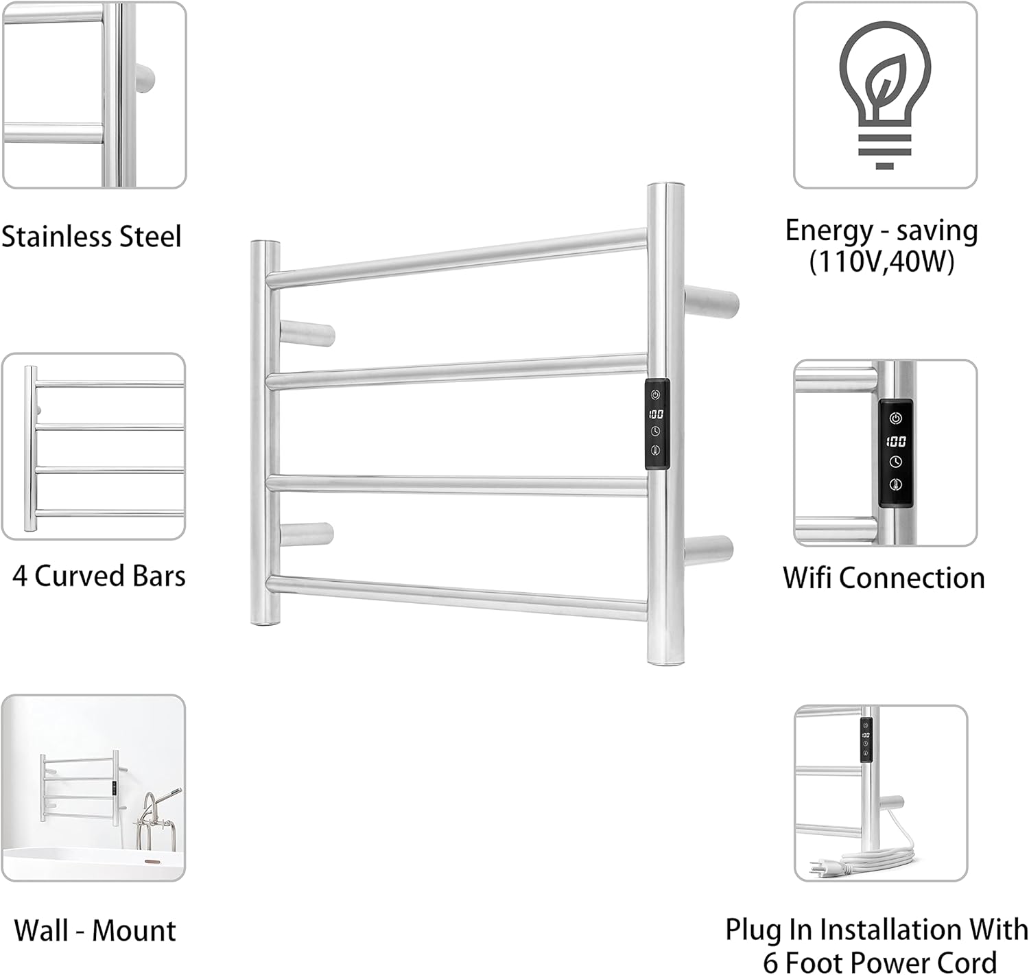 • [PREMIUM QUALITY WITH ELEGANT LOOK]: The bath towel warmer is made of durable 304 stainless steel, easy to clean and durable use. IP56 Waterproof standard and wall-mounted design maximizes your floor space.