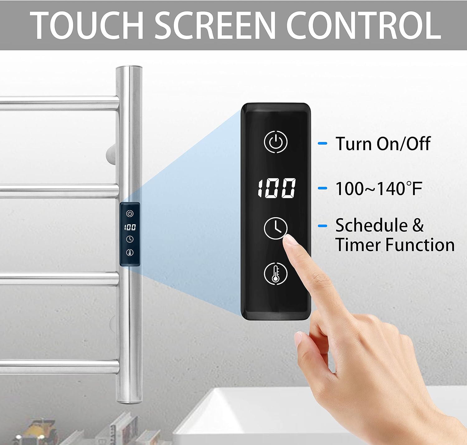 • [TOUGH SCREEN CONTROL]: Manually to turn on/off anytime. Countdown Timer function from 1 hour to 8 hours. Temperature control from 100°F to 140°F.
