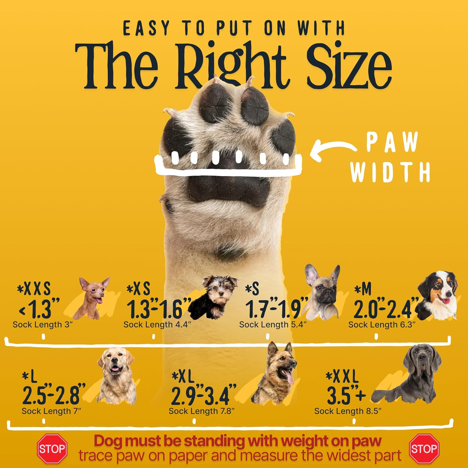 • Medium fits paws 2" - 2.4". Measure while dog is standing with weight on paw. Includes 4 dog grip socks. Snug fit is normal—extra grip makes them stiffer than other socks but provides better traction.