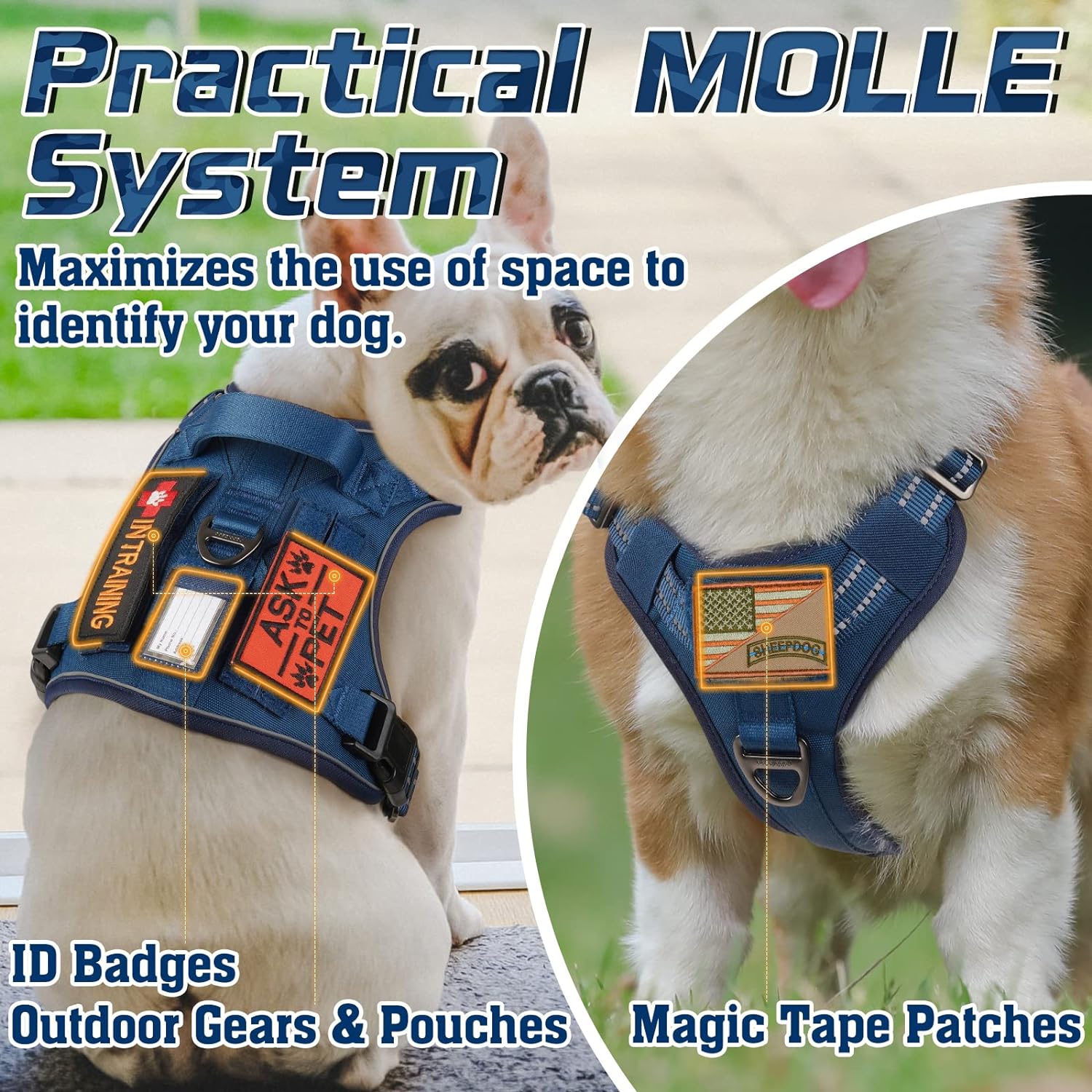 • More DIY Space: MOLLE system equipped on both sides of the tactical harness for pouches, water bottles and outdoor gears. You can attach personalized badges, morale patches on the hook & loop panels. Insert the ID card into the card slot to identify your dog. Widely used for personal service, law enforcement, hunting, or outdoor recreation