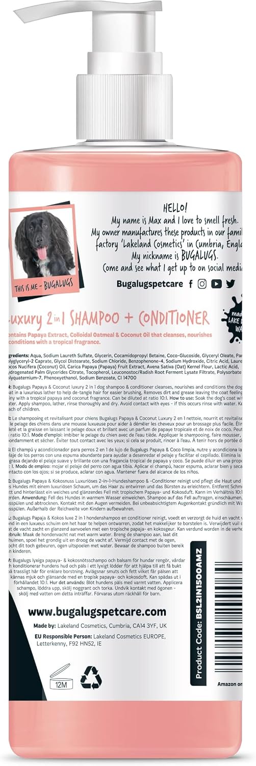 • 2 in 1 dog shampoo & conditioner– that cleanses, nourishes and conditions your dog’s coat with a tropical papaya & coconut fragrance.