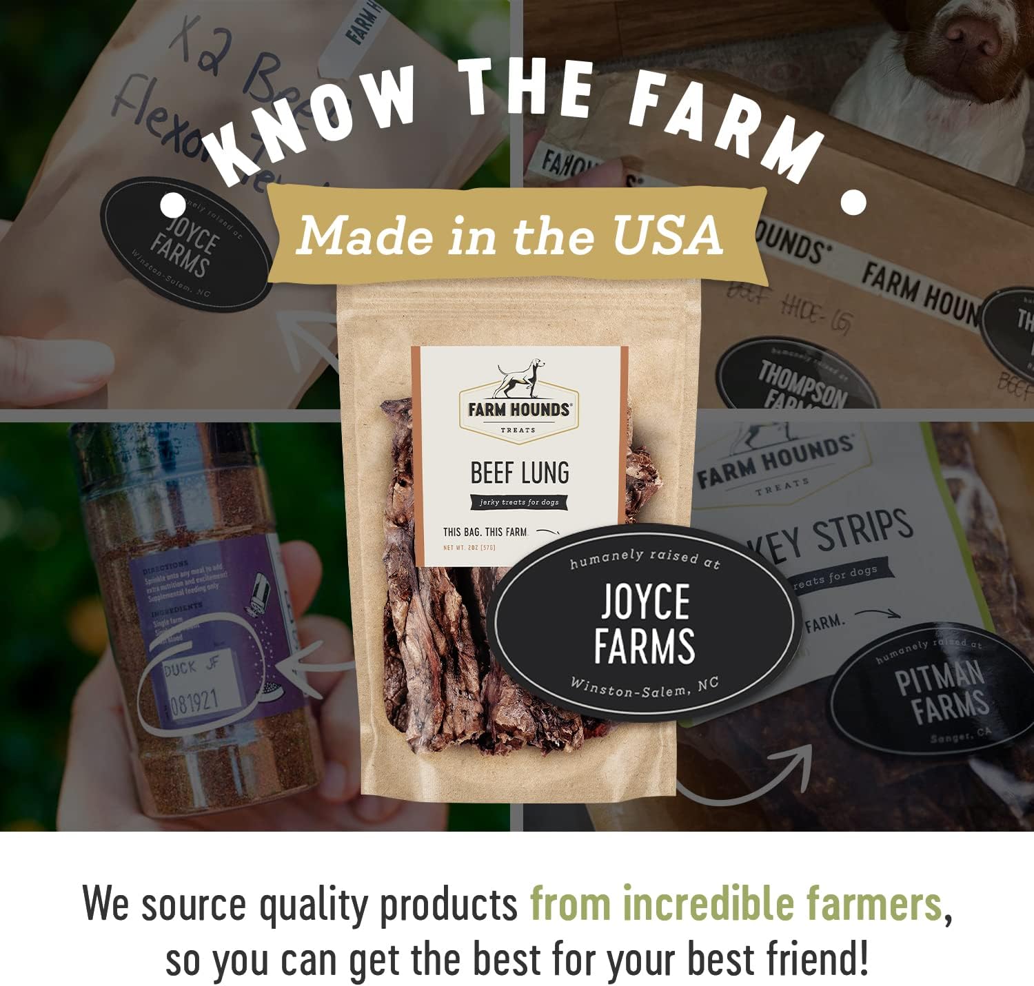 • FARM HOUNDS - At Farm Hounds, we believe healthier animals are happier animals. With your canine in mind, we make all of our treats nutritionally beneficial and delicious. Our close relationship with all-American family farmers who raise their animals in a humane way, helps us use premium raw materials for our products.