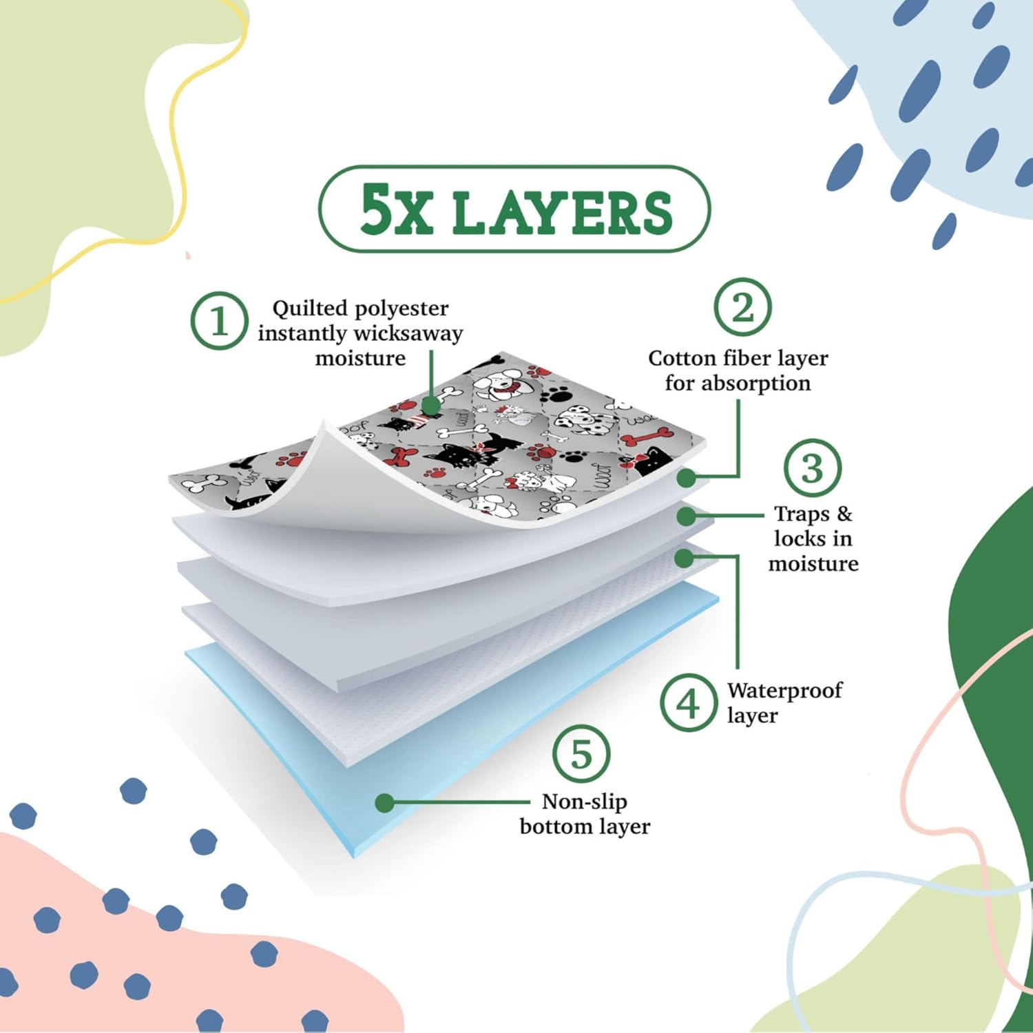 • Highly Absorbent: Our 5 layer washable puppy pads are soft and highly absorbent. Perfect as wee wee pads for dogs, reusable dog training pads, and reusable dog pee pads.