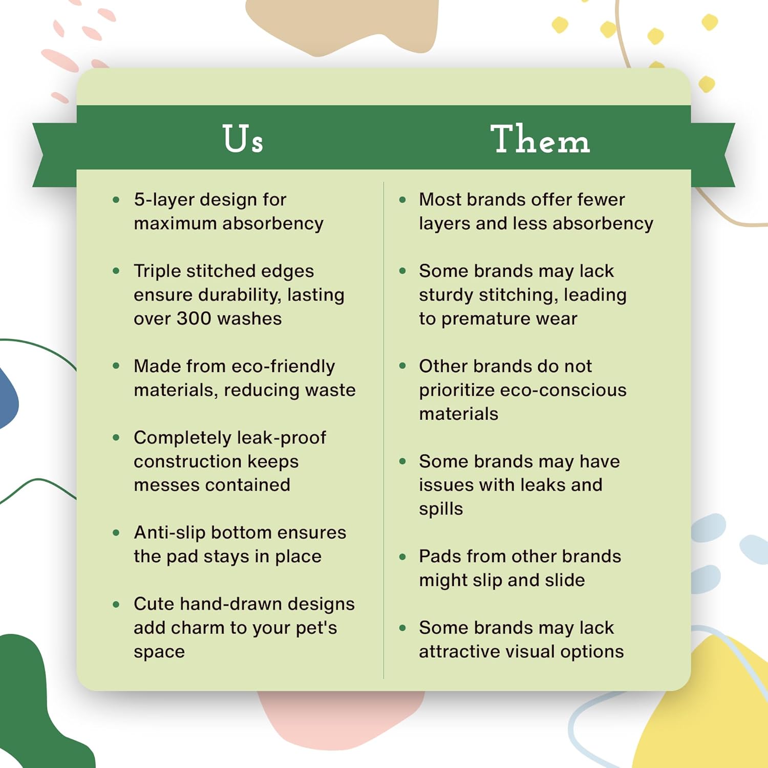 • Sustainable: Our reusable pee pads for dogs are an earth friendly, money-saving alternative to disposable dog pee pads, making them the ideal pet pads. So durable they withstand hundreds of washes.