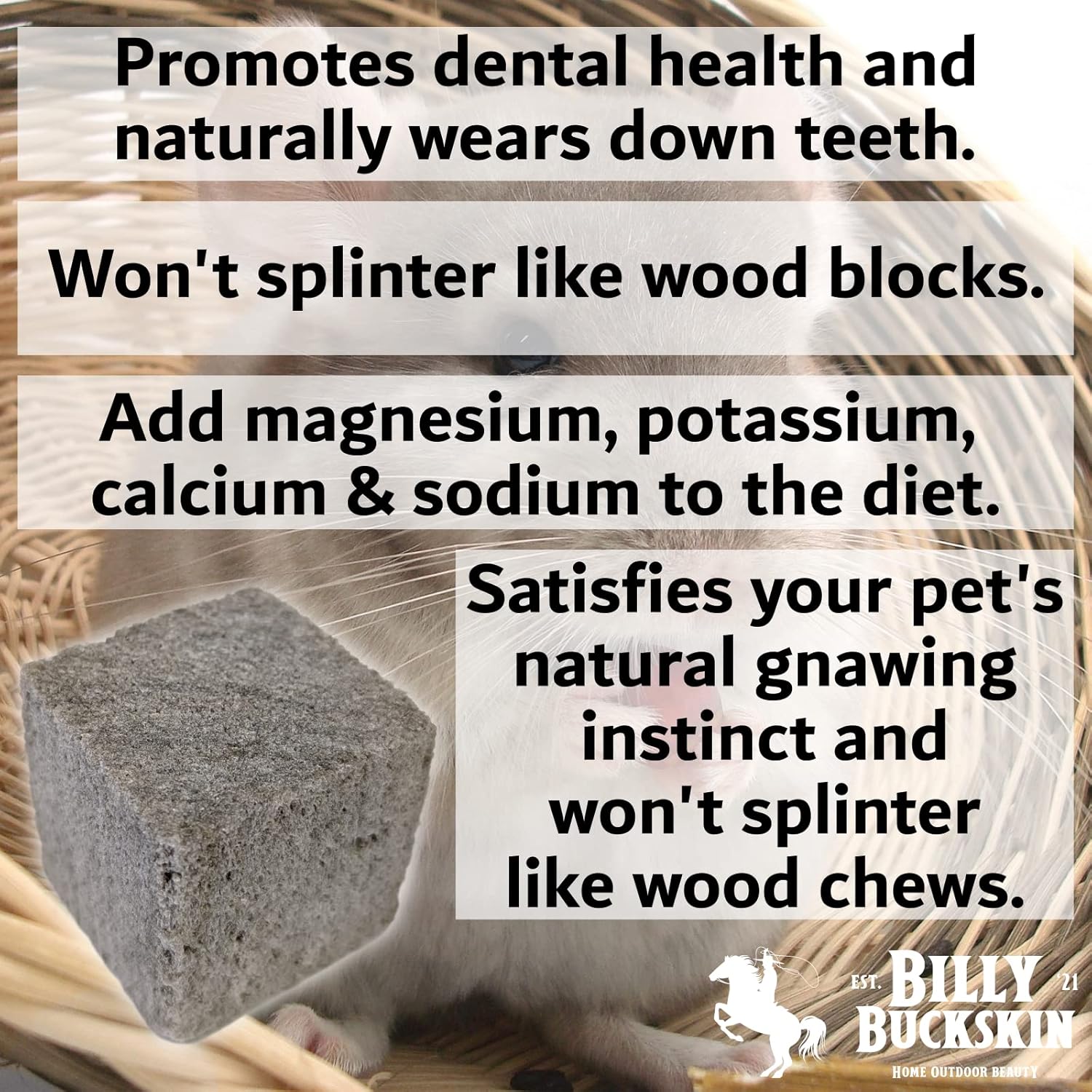 - NATURAL CHEW TREATS WITH NUTRIENTIONAL BENEFITS - Billy Buckskin Pumice Rabbit Treats are more than just engaging chew toys—they naturally support dental health and offer trace mineral benefits for rabbits, guinea pigs, hamsters, chinchillas, and other small pets. Ideal for daily cage enrichment, these nutrient-rich pumice stones help wear down teeth safely while promoting activity and overall well-being.