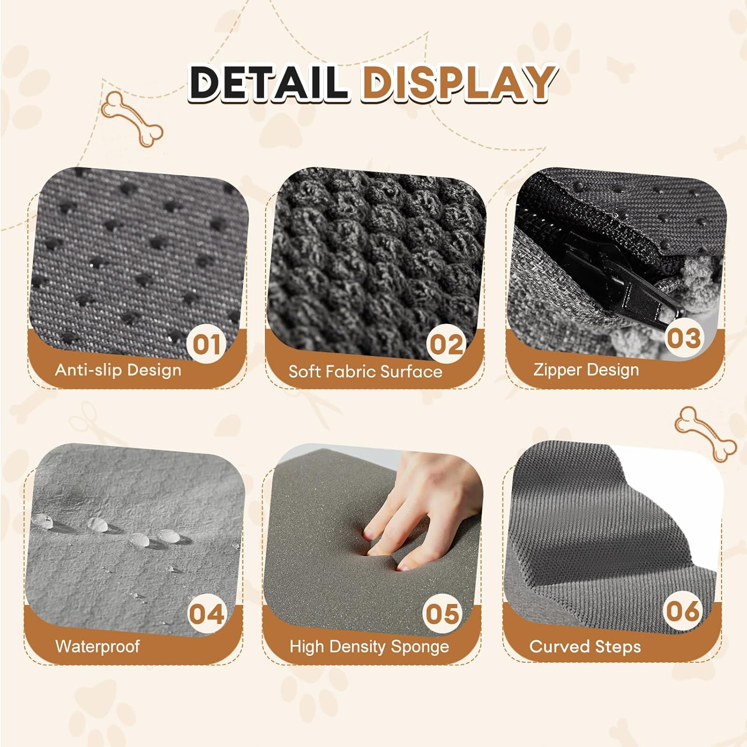 - STABLE AND NON-SLIP: Surface layer of the dog ladder is made of thick coral fleece, providing a soft and non-slip experience for your pet's feet. Back of the coral fleece is a waterproof layer, so you won't worry about the dog peeing. Side of the dog stairs for high beds is made of wear-resistant cotton and linen so that dog can grind it's paws. Bottom is made of non-slip nylon, which can be firmly attached to the ground to ensure the stability of the dog steps, and dogs can climb easily