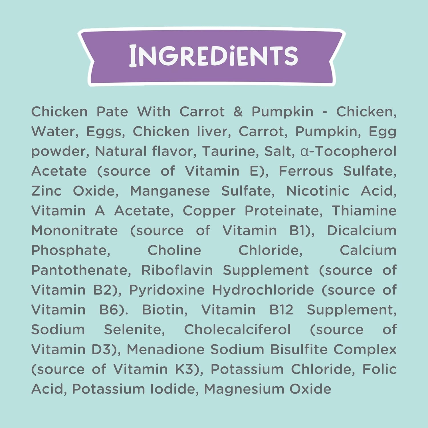 • GRAIN FREE & NON-GMO: Our pate chicken, carrot, & pumpkin is prepared without any grains, artificial additives, or by-products, as our goal is to feed cats the way nature intended. We always source wholesome ingredients to promote optimal health and nutrition.