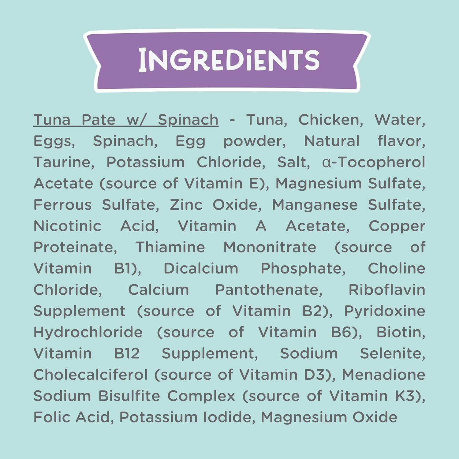 • GRAIN FREE & NON-GMO: Our pate tuna and spinach is prepared without any grains, artificial additives, or by-products, as our goal is to feed cats the way nature intended. We always source wholesome ingredients to promote optimal health and nutrition.