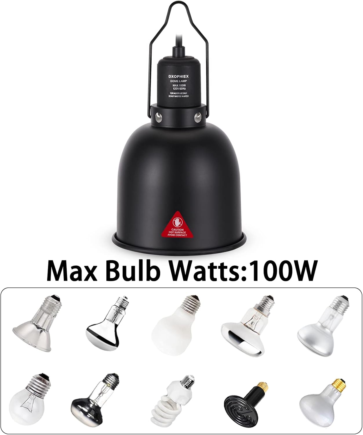 • 【5.5 inch Deep Dome, Max 100W】: This 5.5 inch reptile heat lamp fixture is suitable for bulbs with a maximum power up to 100W, it can be equipped with reptile ceramic heat lamp, UVB UVA basking spot lamp, UVB reptile light, daylight lamp, nightlight lamp, infrared spot lamp and so on.