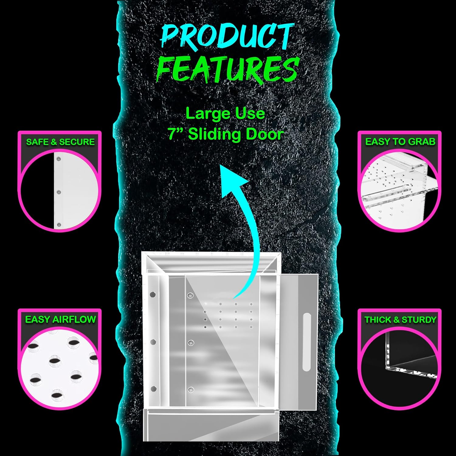 • Acrylic Reptile Enclosure: Our terrariums are a crystal clear acrylic box made for 360 degree viewing, offering 5mm thick acrylic walls, making them sturdy. These reptile tanks come equipped with a 7” sliding magnetic door and a 3” handle for easy handling along with 3mm holes for ventilation and air circulation.