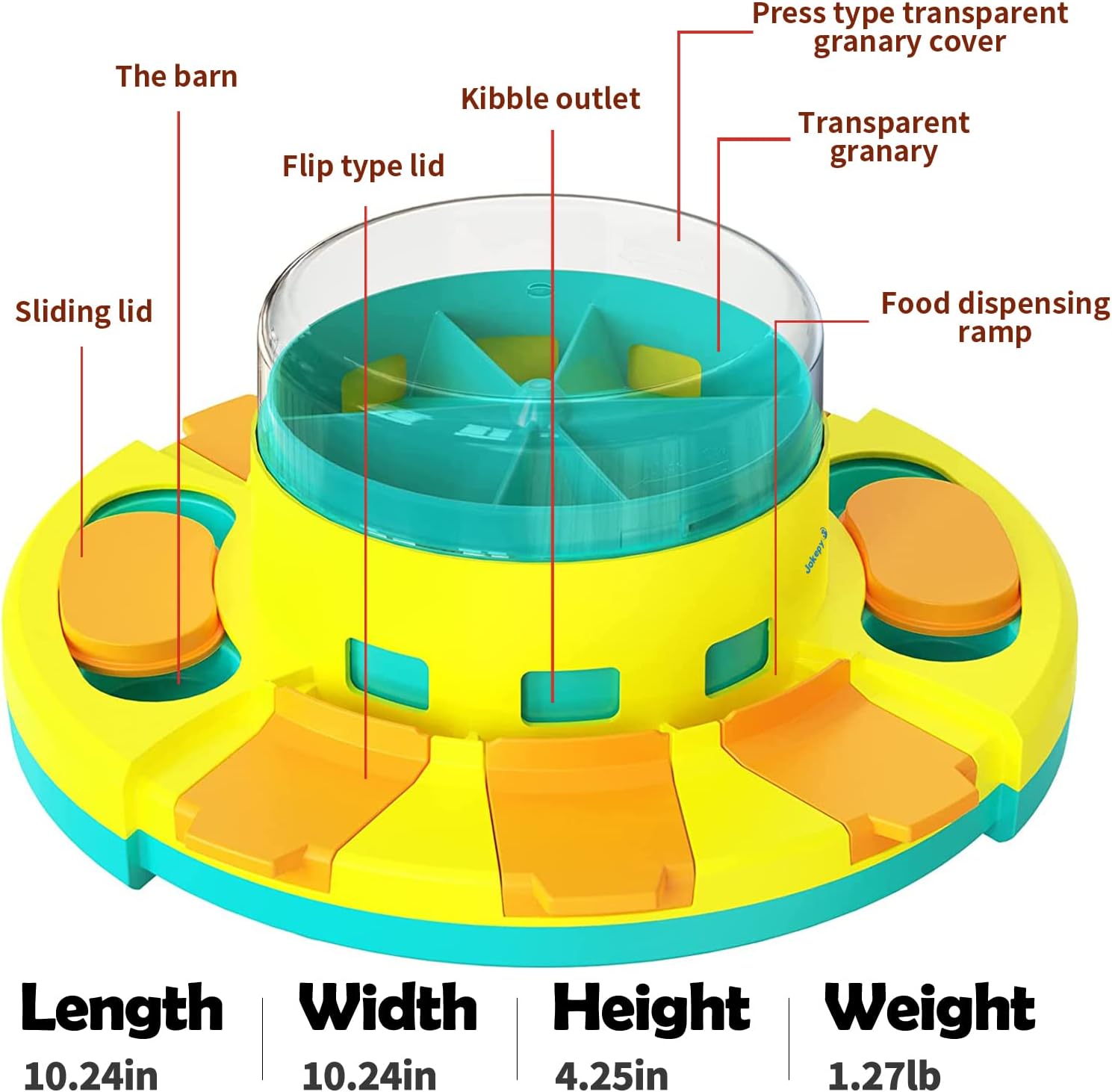 • 🐾【Easy to Use】Dog puzzle toys have 6 flip type lids, you can add food to the granary, pets press down on the transparent lid, food will fall into the leaky food-box. Pets also can eat food by moving 2 sliding lids.