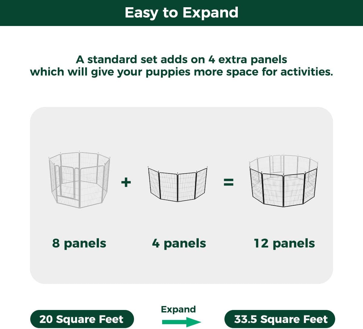• Super easy to assemble: It won’t take you more than 5 minutes to assemble these portable dog fences as well as pack them away due to the rod-connected design. Meanwhile, panels can be added or removed freely to give you a fully flexible area and arrange the dog pen in any shape you need.