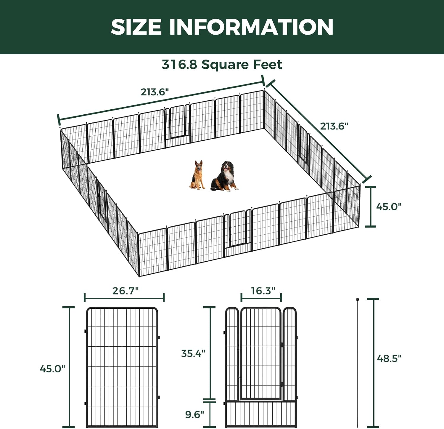 • Super easy to assemble: It won’t take you more than 5 minutes to assemble these portable dog fences as well as pack them away due to the rod-connected design. Meanwhile, panels can be added or removed freely to give you a fully flexible area and arrange the dog pen in any shape you need.