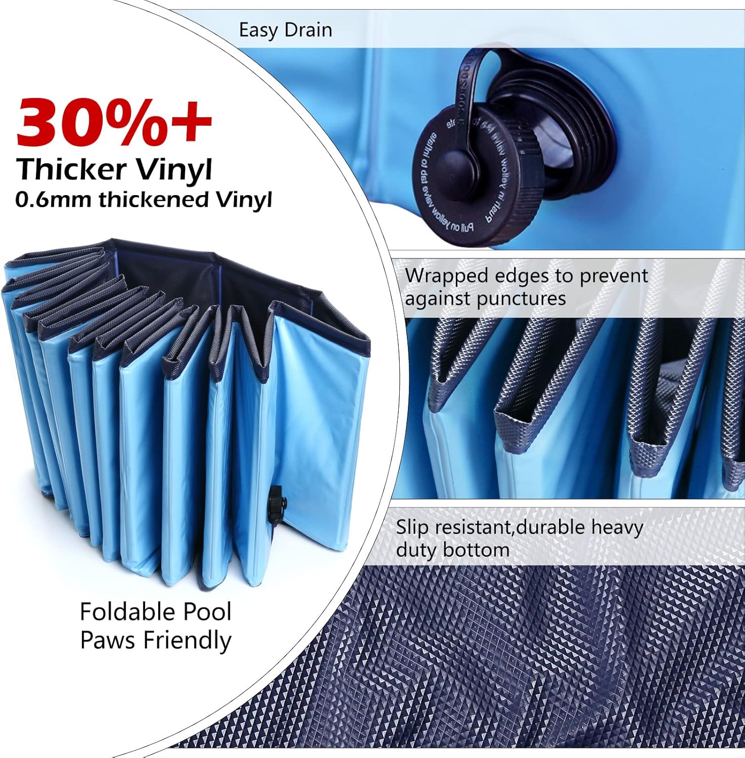 • Slip Resistant and Paws Friendly --- Inner wall and the bottom is made of extra-tough embossed plastic. Thick and non slip bottom. No slips and falls. Full size pools for puppy, small dogs, medium dogs and large dogs and kids. Please Trim your dogs' nails before using the pool.