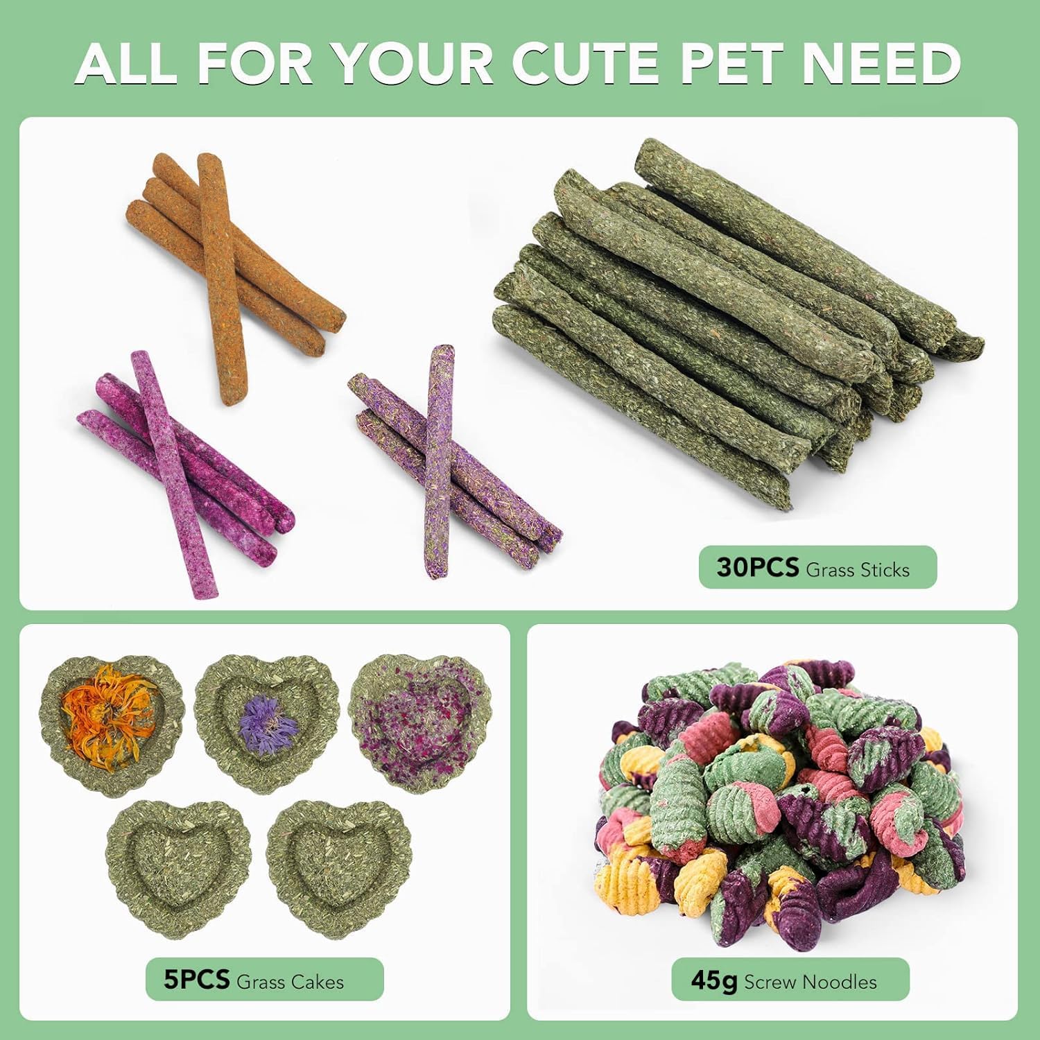 • 【SUPER VALUE PACK】 our rabbit treats set includes rose grass stick ×4, calendula grass stick ×4, myosotis grass stick ×4, timothy hay sticks ×18, timothy grass cake ×2, calendula grass cake ×1, rose grass cake×1, myosotis grass cake ×1, screw noodle snack ×45g.