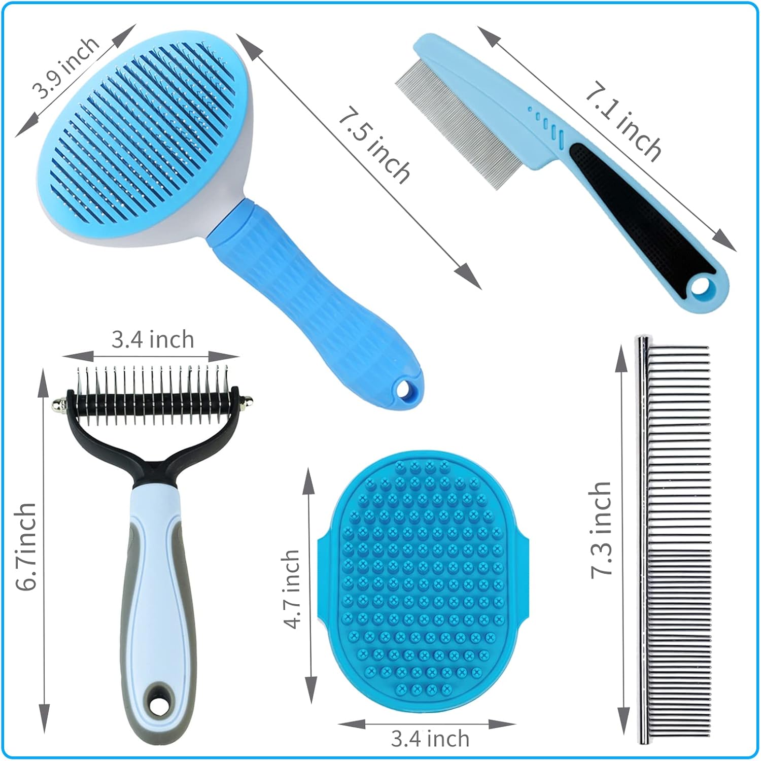 Dog Brush Grooming Kit 5PCS - Dog Brushes for Grooming, Dog Brush for Shedding,Puppy Brush and Flea Comb for Dogs, Slicker Brush Comb and Dog Hair Brush Set Blue