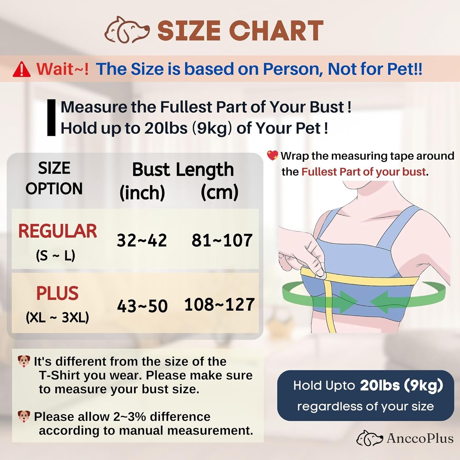 - [SIMPLE SIZE & PERFECT FIT] Please measure your fullest part of your bust and choose your size on the size chart. There are two simple sizes, Regular (S~L) and Plus (XL~3XL). Regardless of your size, our dog carrying sling is designed as small dog carrier up to 20lbs(9kg). The 95% Cotton is extra soft, and the 5% Spandex gives the elasticity which allows our dog sling carrier for small dogs to conform to your pet's shape, ensuring maximum comfort for both you and your pet during use