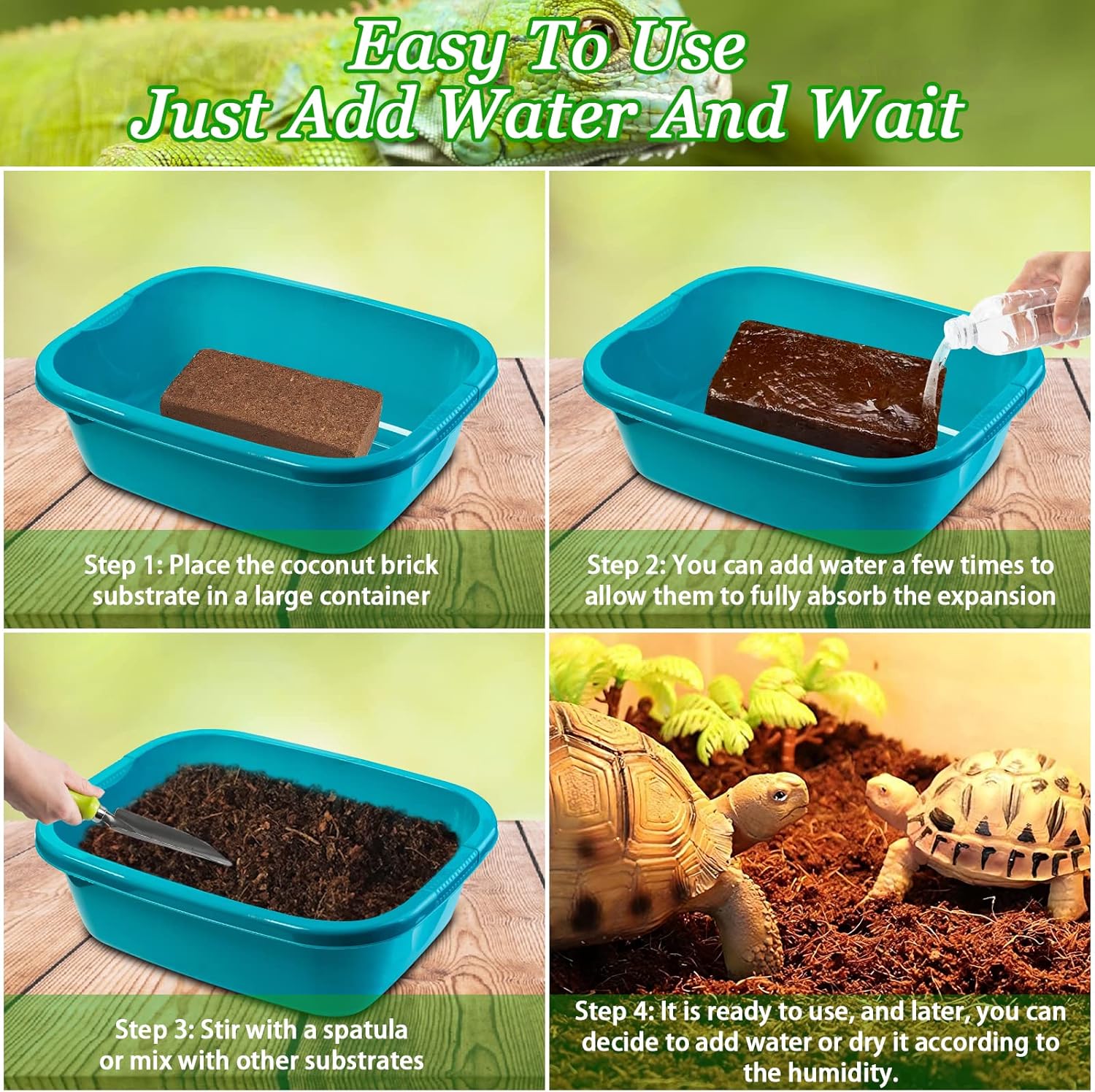 • Easy to Use and Store: These coco bricks are compressed and dense. Just soak the brick in water, coco coir will instantly and easily soak up water and expand into a clean, fluffy substrate. Our Coconut husk fiber is a great substrate for any reptile or amphibian that needs a substrate / bedding that can retain moisture