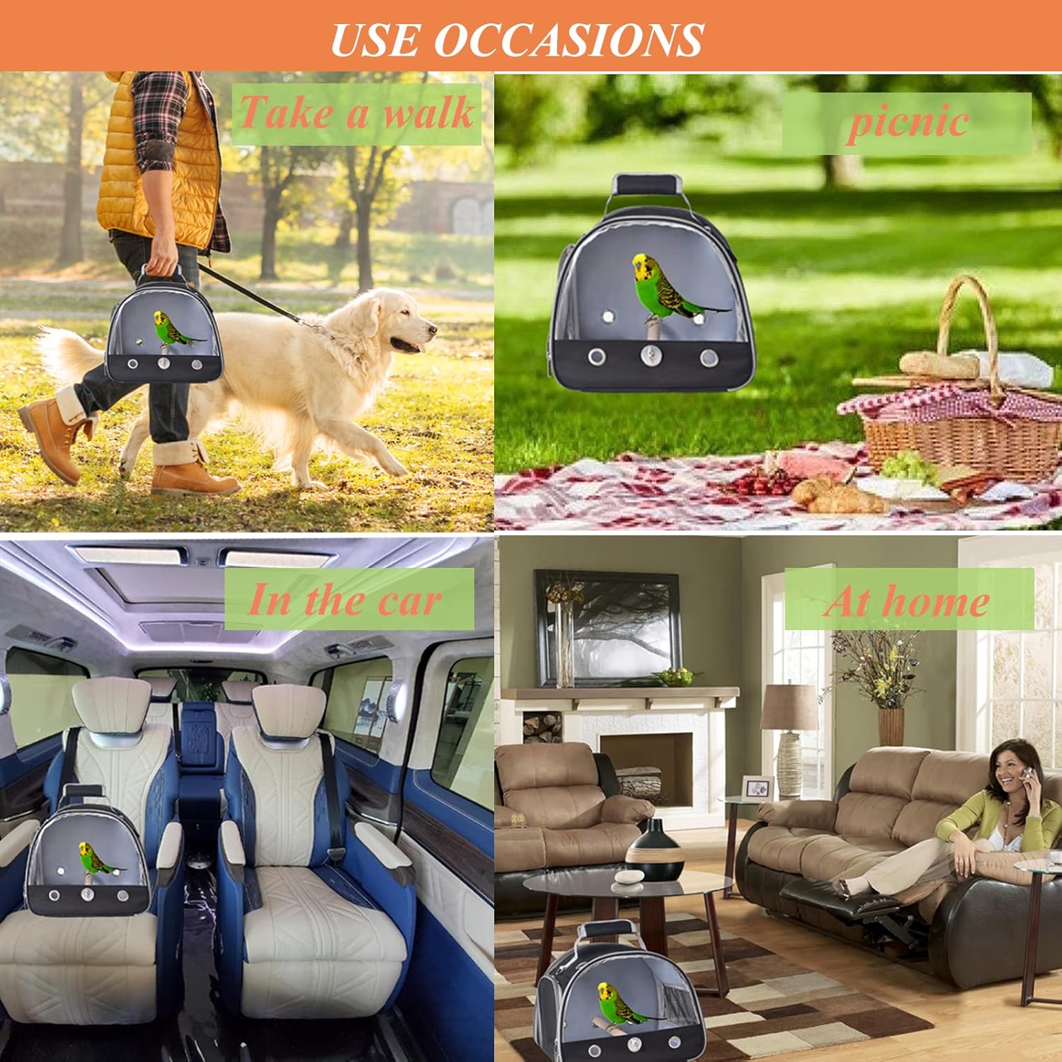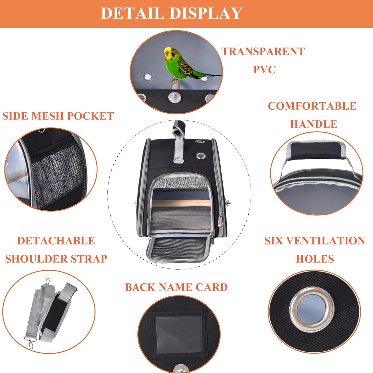 • 1.Big Transparent Window: There is a large transparent window made of PVC in the front of the bird carrier bag. This clear window allows small pets to see the scenery outside during their travels, and you can keep an eye on your pets at all times